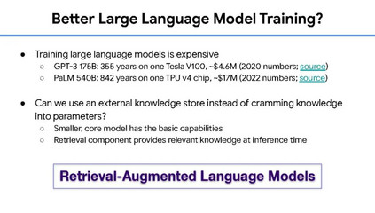 虽然大规模语言模型工作得非常好,但训练它们的成本很高,很难解释它们的预测,而且几乎不可能随着时间的推移保持最新。目前还不清楚我们什么时候可以相信他们的预测,而且目前的大型语言模型都不能回答关于当前主题的问题,例如COVID-19,因为用于训练的语料库是几年前创建的。为了开发具有更小、更简单和更有效的模型的下一代通用语言模型,我们相信信息检索是一个关键组件。在人与人之间以及与世界进行交互时,人类会挖掘许多不同形式的知识,包括世界知识(例如常识、最新的世界事实、热门新闻)和用户知识(例如对话记忆、社交互动、额外的上下文(例如位置等)。为了在AI应用程序中结合这种能力,信息检索提供了模型对可能包含此类知识的文档集合的访问(可能很大)。具体来说,完整的系统由一个小型的核心模型组成,可以通过检索轻松访问额外的、与任务相关的知识,并与当今最大的语言模型相媲美。在本次演讲中,我将首先对检索增强语言模型进行研究概述。然后,我将分享我们最近的一些工作,包括一个通过添加检索组件来改进任何语言模型的通用框架,以及一个检索增强的多模态模型,该模型可以生成质量更好的图像和标题。最后,我将通过讨论我们学到的一些经验教训和我们计划在不久的将来解决的问题来结束这次演讲。