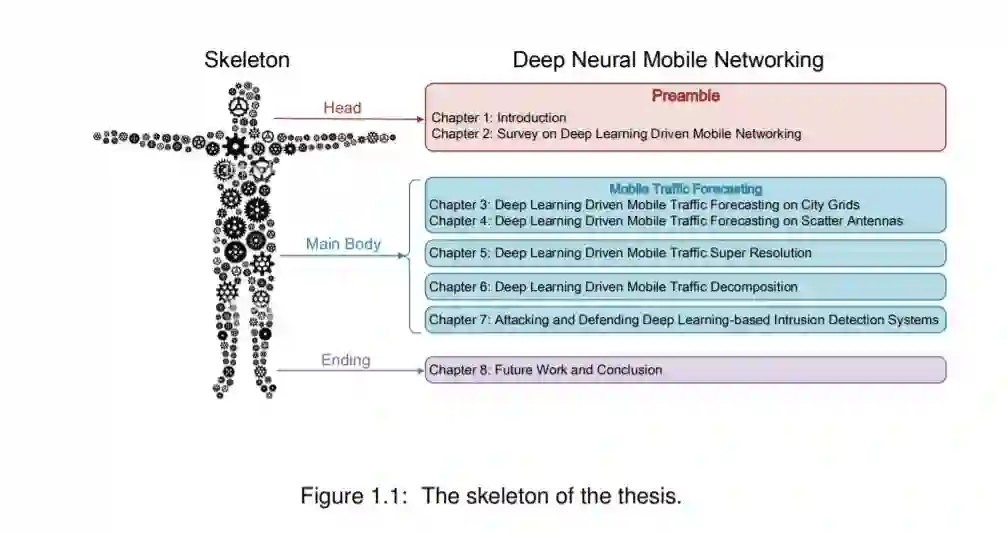 本文利用深度神经网络的最新进展,从不同的角度研究移动网络领域的重要问题。作为开场白,我们通过一项关于深度学习和移动网络之间交叉关系的调查,来缩小深度学习和移动网络之间的差距。其次,我们设计了专门的深度学习架构来预测城市规模的移动流量消费。特别是,我们针对不同的移动流量数据结构(即来自城市网格和地理空间点云天线部署的数据)定制了我们的深度神经网络模型,以提供精确的预测。接下来,我们提出了一种移动流量超分辨率(MTSR)技术,利用生成对抗网络架构实现移动流量测量的粗到细粒度转换。这可以为移动运营商提供关于移动流量分布的深度知识,同时有效地减少数据后处理开销。随后,提出了基于深度学习的移动流量分解(MTD)技术,将聚合的移动流量测量数据分解为服务级时间序列。使用MTD,移动运营商可以为网络切片(即物理基础设施的逻辑分区)执行更有效的资源分配,并减轻深度包检查的广泛使用带来的隐私问题。最后,我们以一个真实的黑箱威胁模型研究了网络特定深度异常检测器的鲁棒性,并提出了可靠的解决方案,以防御那些试图颠覆现有的基于深度学习的网络入侵检测系统(NIDS)的攻击。