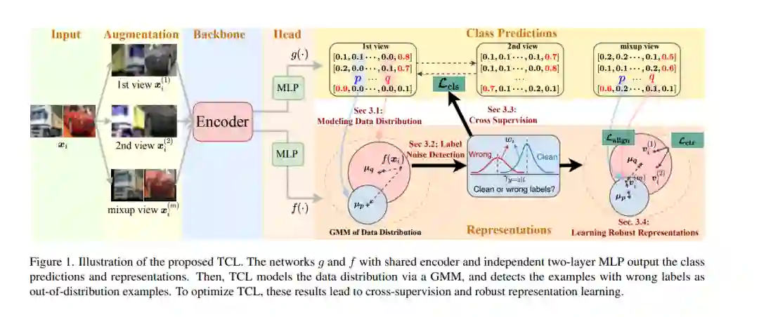 从噪声数据中学习是一项具有挑战性的任务,会显著降低模型的性能。**本文提出TCL,一种新的孪生对比学习模型,用于学习鲁棒表示并处理用于分类的噪声标签。**通过将监督模型预测注入到高斯混合模型中,在表示上构建高斯混合模型(GMM),将GMM中的无标签潜变量与标签噪声注释联系起来。然后,TCL在考虑数据分布的情况下,利用另一个双分量GMM将标签错误的样本检测为分布外样本;本文进一步提出一种具有熵正则化损失的交叉监督,从模型预测中引导出真实目标,以处理噪声标签。因此,TCL可以通过混合学习和对比学习来学习与估计标签相一致的判别性表示。在多个标准测试集和真实数据集上的大量实验结果表明,TCL具有优越的性能。特别是,TCL在CIFAR-10上实现了7.5%的改进,其中90%的标签是噪声非常大的场景。源代码可以在https://github.com/Hzzone/TCL上找到。