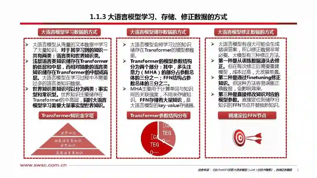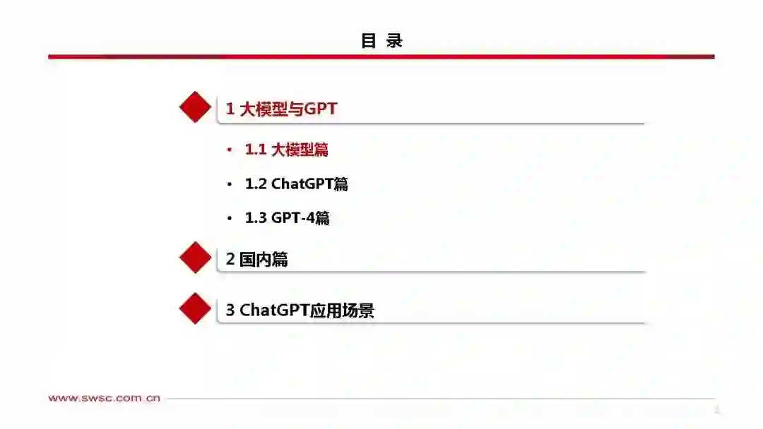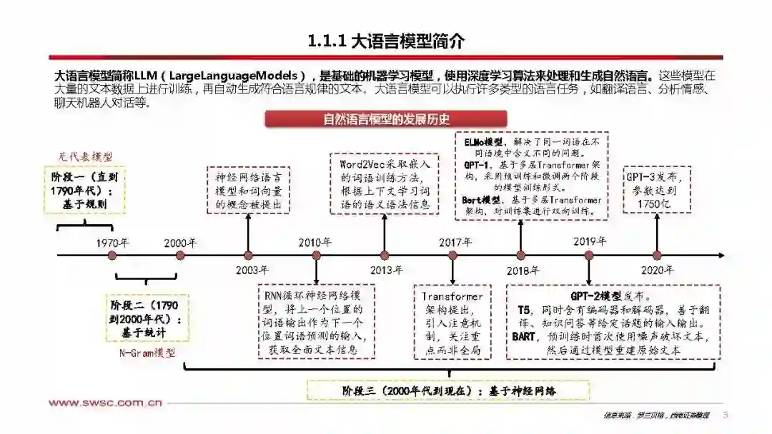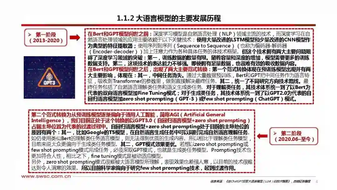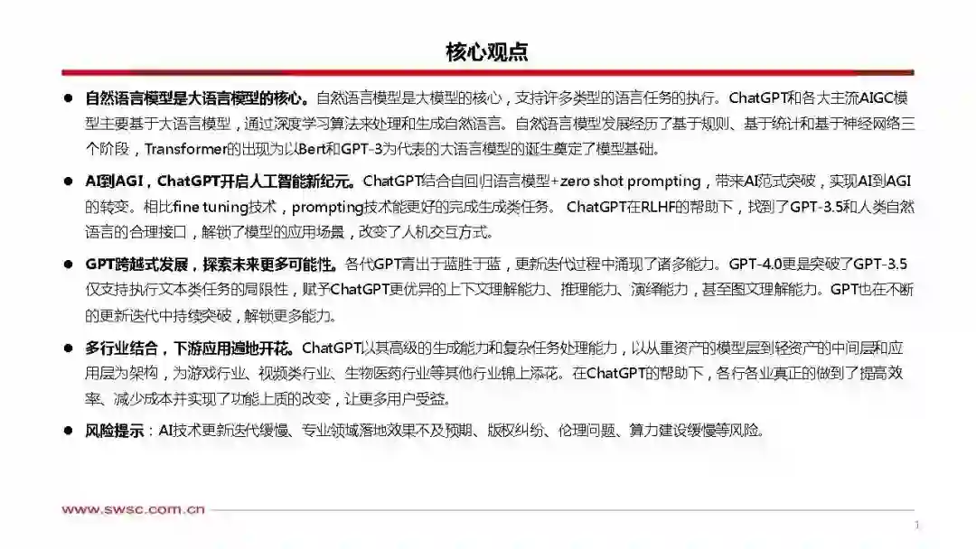 自然语言模型是大语言模型的核心。自然语言模型是大模型的核心,支持许多类型的语言任务的执行。ChatGPT和各大主流AIGC模 型主要基于大语言模型,通过深度学习算法来处理和生成自然语言。自然语言模型发展经历了基于规则、基于统计和基于神经网络三 个阶段,Transformer的出现为以Bert和GPT-3为代表的大语言模型的诞生奠定了模型基础。 AI到AGI,ChatGPT开启人工智能新纪元。ChatGPT结合自回归语言模型+zero shot prompting,带来AI范式突破,实现AI到AGI 的转变。相比fine tuning技术,prompting技术能更好的完成生成类任务。ChatGPT在RLHF的帮助下,找到了GPT-3.5和人类自然 语言的合理接口,解锁了模型的应用场景,改变了人机交互方式。 GPT跨越式发展,探索未来更多可能性。各代GPT青出于蓝胜于蓝,更新迭代过程中涌现了诸多能力。GPT-4.0更是突破了GPT-3.5 仅支持执行文本类任务的局限性,赋予ChatGPT更优异的上下文理解能力、推理能力、演绎能力,甚至图文理解能力。GPT也在不断 的更新迭代中持续突破,解锁更多能力。 多行业结合,下游应用遍地开花。ChatGPT以其高级的生成能力和复杂任务处理能力,以从重资产的模型层到轻资产的中间层和应 用层为架构,为游戏行业、视频类行业、生物医药行业等其他行业锦上添花。在ChatGPT的帮助下,各行各业真正的做到了提高效 率、减少成本并实现了功能上质的改变,让更多用户受益。