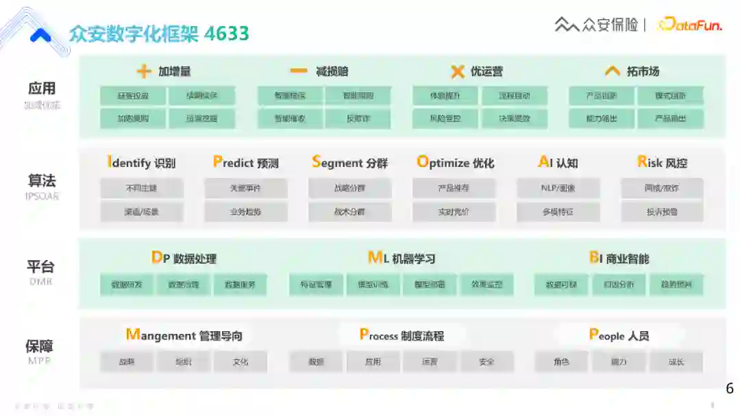 **众安的数字化框架简称4633,主要架构分为4层:应用、算法、平台、保障。**在数据建设过程中,传统的数据公司可能主要会关注性能,比如数据的吞吐量、查询效率等,而众安的数据团队比较强调实际应用,因此比较强调应用和算法这两层框架。