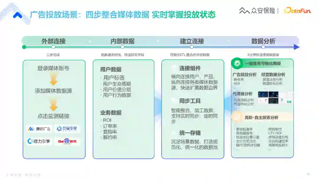接下来以广告投放场景为例,展示我们整个数据工作流。我们的外部数据源包括抖音快手百度腾讯,通过监测连接去获取这些外部数据。内部数据包括用户数据和业务数据。接下来通过快速的连接组件同步工具,达到一键可视化的效果。此外,更高阶的自主探索分析,比如广告的展示点位是否会影响投放效果,保费理赔情况等也是我们关注的。