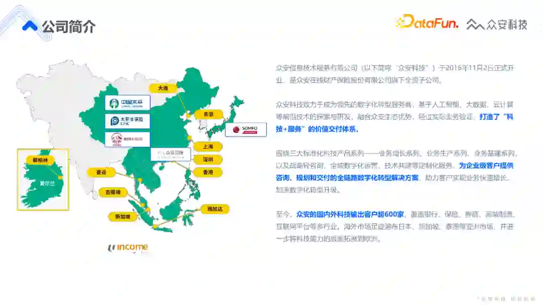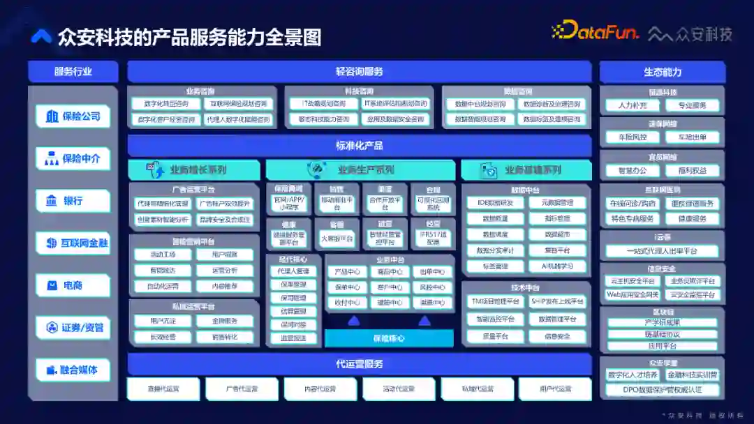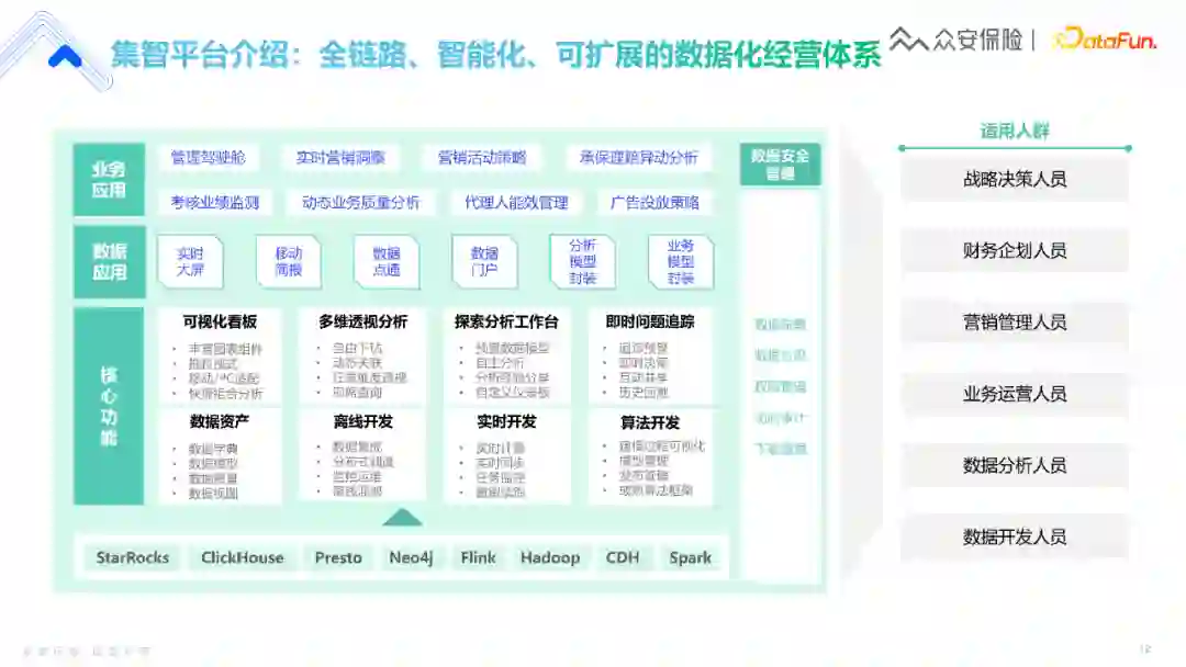 第三件事情是模式,我们希望通过算法模型和基建大数据去做模式的创新。 比如流程创新,目前我们的大部分理赔可以在短时间内完成,没有人工介入,这个过程就涉及到了很多AI算法模型和实时计算,比如特征选取、反欺诈外部数据调用、模型判断、理赔规则生成等。这里并非强调我们的算法模型的超高准确性,或者数据处理量级的高度,而是我们通过实时计算、模型算法等技术去创新理赔业务流程,使得这个流程变得更加的迅速,让用户有最佳的体验。 在产品创新上,比如我们想做宠物险这一产品,就是对宠物的保障,那我们要怎么确定理赔发生时的宠物是当时保的宠物?这里面的反欺诈风险其实非常高,那怎样去做这类保险产品的创新,也是一个待解答的问题。最后是模式上的创新,整个众安的数据团队都在不懈努力的去做了这样一件事。 今天主要和大家分享最基础的运营侧,虽然基础,但是它实际上占据了整个公司运转当中非常重要的部分。接下来我将从运营的角度去介绍我们数据应用情况。 3. 众安数据中台介绍