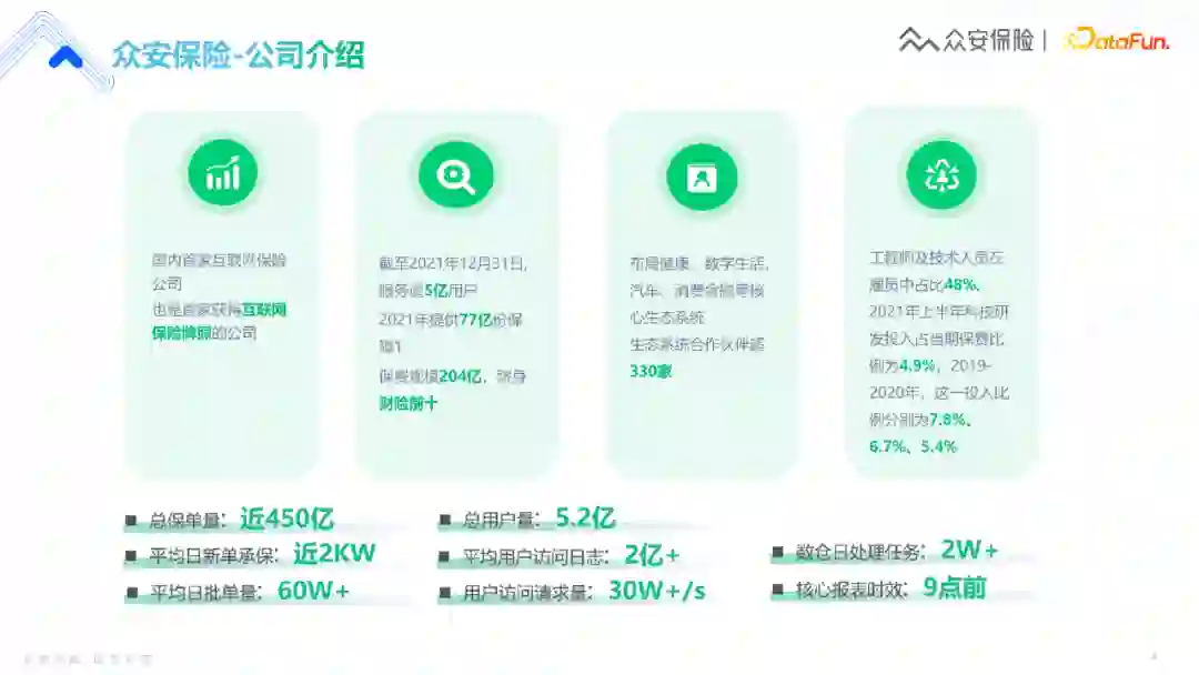 众安保险是一家非常互联网化的公司,人员构成上看,工程师技术人员占比达到了50%左右。虽然人数上无法和电商公司相比,但业务上产生的数据量级以及相应所需的数据处理能力还是比较高。