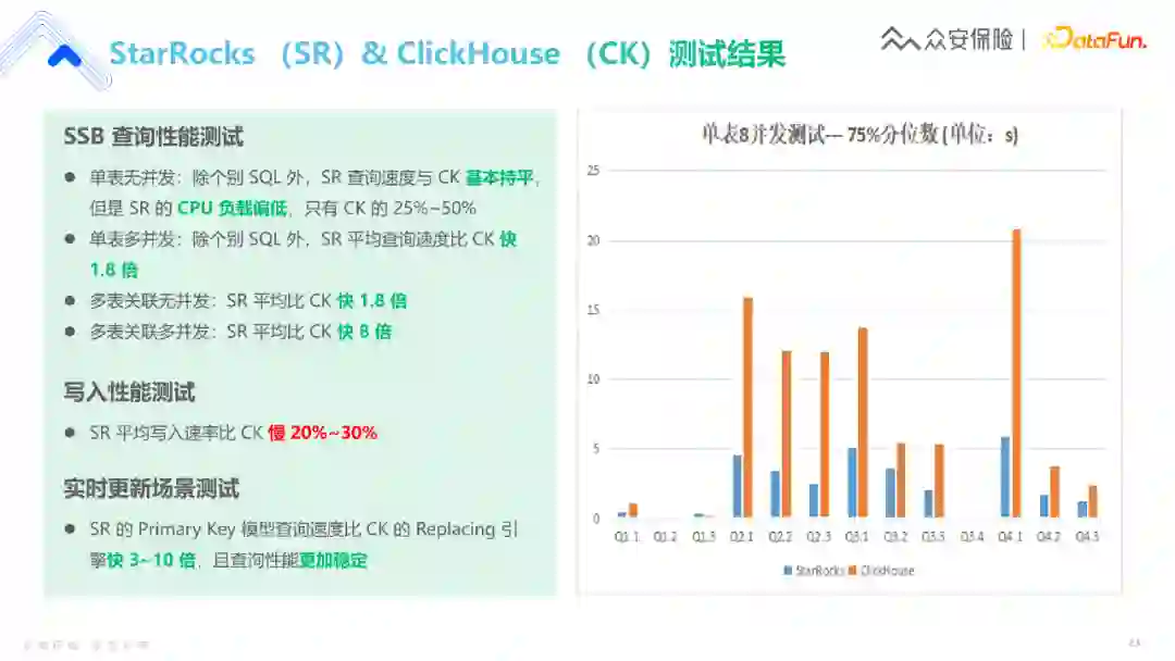 图中是两者的性能试验结果,在单表无并发的情况下,StarRocks与ClickHouse的性能是差不多的,到了多表关联多并发场景下,SR是存在显著优势的。 当然,SR的写入性能存在一定不足,尤其是在批量数据导入的情况,关于这点我们也在持续与SR团队进行沟通。 这里想和大家分享的是,数据系统有它的发展阶段,要想让工具更好地服务于公司,还是要分析使用场景。