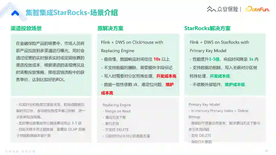 在广告投放场景中,实时性的要求非常高,数据链路较为复杂,可能包含七八个节点。 以往通过clickHouse加上Replacing Engine进行查询时,需要10s以上的响应时间。此时,业务同学会有抱怨,有时可能需要暂停业务动作,等数据出来再去推进工作。 之后我们选择了Flink on StarRocks的架构,结合众安的集智平台,性能提升了3-5倍。 今天主要和大家分享了,众安数据团队如何通过更精细化、更快速高效的的报表分析系统搭配引擎,解决运营当中的数据分析问题。