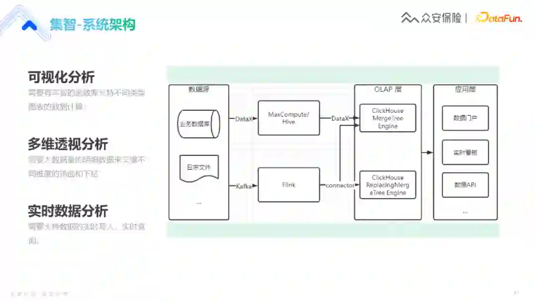 首先展示原来的集智平台技术架构,比较核心的是离线和实时两个处理链路。在OLAP引擎层,经过一些探讨和尝试,我们选取了以ClickHouse为主的OLAP查询层。之后输出到应用层,比如数据API、报表或者多维分析等。整个链路还是比较高效。