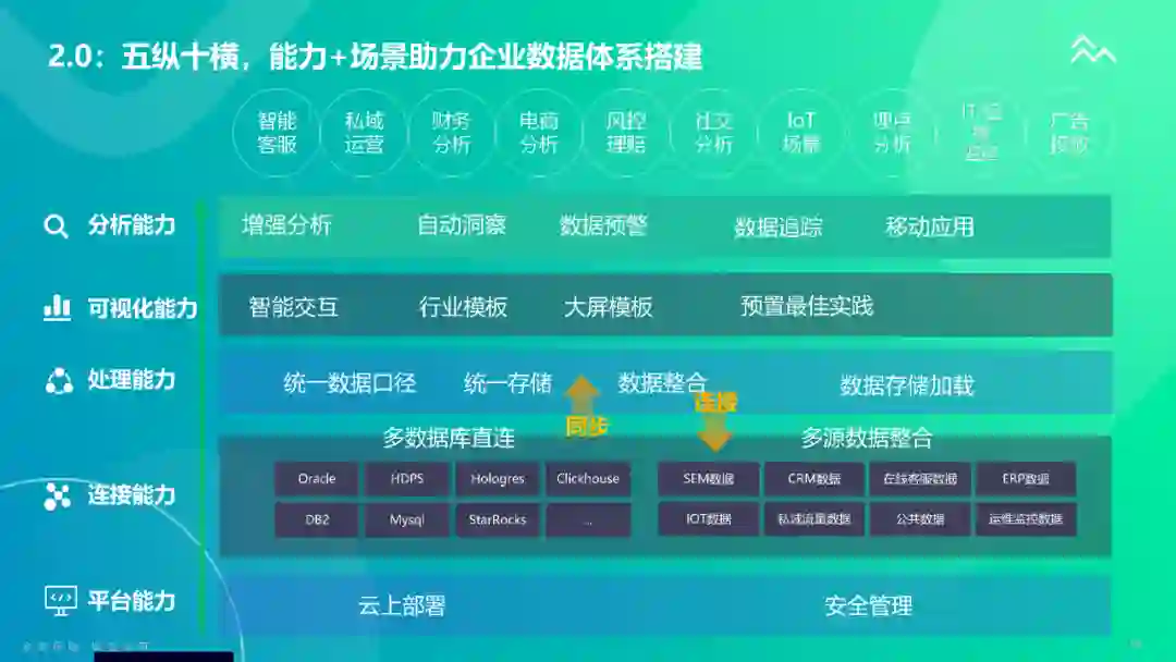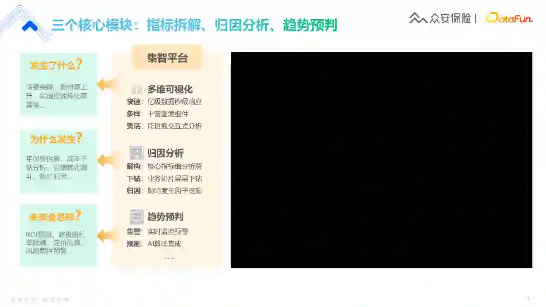 **我们的核心模块是:发生了什么,为什么发生,未来会怎么样。**要解答“发生了什么”,要去做多维可视化,这就需要数据粒度细、响应达到秒级,在此基础上可以做各种聚合。 第二块是一些既定的分析,比如为什么某个指标会变动30%?业务人员会问,老板也马上要问。通过做保费的拆解、成本的下钻、营销转化漏斗的分析,判断变动原因是市场变化、还是运营策略变化、还是竞品的变化,这其实都是数据变动的归因分析。