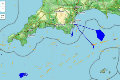 图:使用基于 OPIS 本体的知识图从 AIS 数据(显示为橙色)推断出拖网事件(显示为蓝色)。这些事件是使用逻辑推理来识别的,给定一组描述拖网行为(即模式)的特征,这些特征使用通用事件逻辑表示。