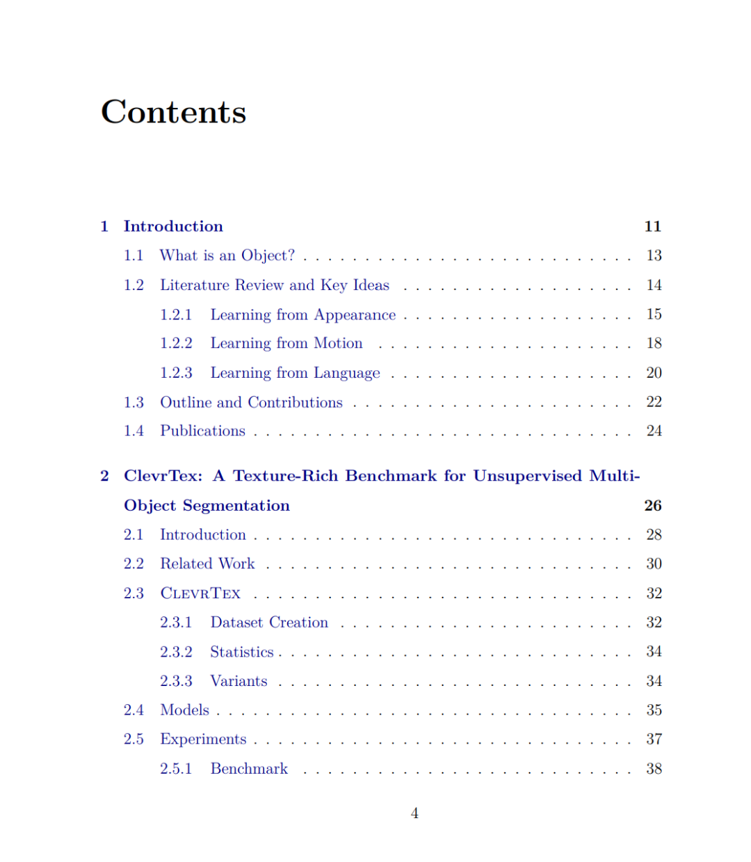 视觉世界由离散的、有意义的物体组成,人类能够在没有监督的情况下轻松地感知并分割这些物体。在计算机视觉中模拟这一能力是一个根本性的问题,为监督方法提供了一种更具认知合理性和可扩展性的替代方案。本文探讨了不依赖于密集掩码标注的情况下,发现视觉物体的原则性方法。 首先,我们探讨了组合性原则(principle of compositionality),该原则认为场景是由离散的、可重用的物体组成的。基于这一原则,已有许多方法,但我们注意到它们仅适用于简单的环境。为此,我们引入了一系列新的基准数据集,分析现有方法是否能扩展到视觉上复杂的输入。大多数方法在处理复杂场景时表现不佳,需要更简单、统一的外观才能产生良好的分割效果。 其次,我们探讨了共同命运原则(principle of common fate),该原则认为一起运动的实体应当被归为一组。我们设计了几种损失函数,将掩码预测与场景运动的估计关联起来,以处理二物体和多物体的场景。我们提出的这些方法可以应用于各种现有的分割方法,借助运动学习来补充其学习原理。 随后,我们考虑了瞬时运动的局限性,并提出了使用稀疏点轨迹来整合长期运动信息。为实现这一目标,我们设计了一种损失函数,强化了这样一个理念:一个物体中的轨迹应具有较高的冗余性。 最后,我们探索了如何利用现有语言结构来进行物体分割,而无需任何密集的掩码标注。我们构建了一种开放词汇分割方法,使用预训练的文本到图像扩散模型(text-to-image diffusion model)将语言与物体的视觉表示相连接。这种方法避免了进一步训练,展示了文本到图像扩散模型作为强大的开放词汇分割方法的潜力。