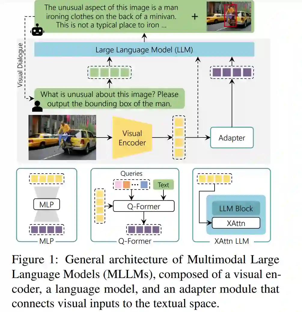 注意力操作符和Transformer架构(Vaswani et al., 2017)的引入,使得创建能够处理各种模态的模型成为可能,并且这种处理能力在不断扩大的规模上得到应用。这一进步很大程度上归功于操作符的多功能性和架构的适应性。最初,这一突破被用于语言特定模型(Devlin et al., 2018; Brown et al., 2020),但很快扩展到支持视觉处理骨干(Dosovitskiy et al., 2021),最终用于集成多种模态的模型(Radford et al., 2021)。复杂大型语言模型(LLMs)的涌现,特别是它们进行上下文学习的能力,鼓励研究人员将这些模型的应用范围拓宽到多模态,包括作为输入和输出。这一扩展导致了如GPT-4V(Achiam et al., 2023)和Gemini(Anil et al., 2023)等尖端模型的开发,展示了最先进的性能。多模态大型语言模型(MLLMs)的开发涉及将视觉和语言的单模态架构合并,通过视觉到语言的适配器建立它们之间的有效连接,并设计创新的训练方法。这些方法对于确保模态对齐和准确遵循指令的能力至关重要。在新模型快速发布的背景下,我们的目标是提供关于MLLM领域的全面概述,重点关注利用视觉模态的模型。这一概述既是对当前状态的更新,也是对未来发展的灵感来源。我们确定了定义这些模型的三个核心方面:它们的架构、训练方法以及它们被设计来执行的任务。我们首先详细介绍了流行的视觉编码器选择和为LLMs装备跨模态能力的适配器模块。接着,我们深入训练过程和使用的数据。然后,我们探索MLLMs处理的任务范围。综述以对该领域持续存在的挑战和未来研究的有希望方向的讨论结束。关于训练数据、评估数据集以及性能和计算要求的进一步细节在补充材料中报告。