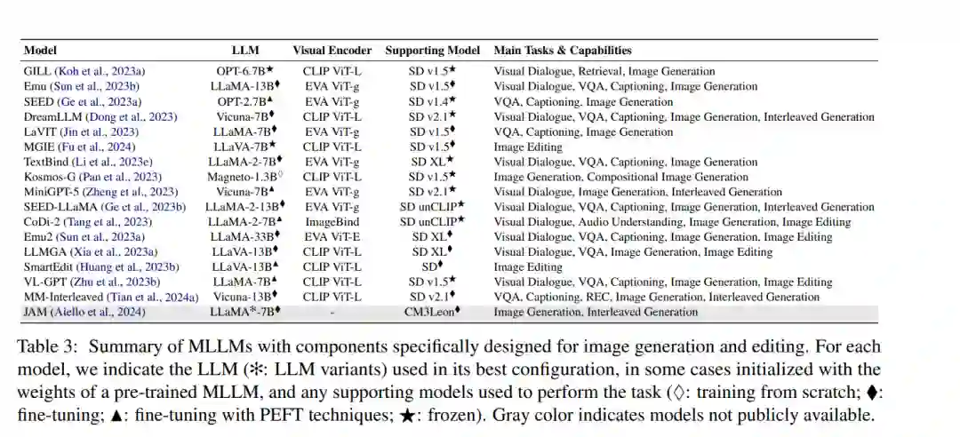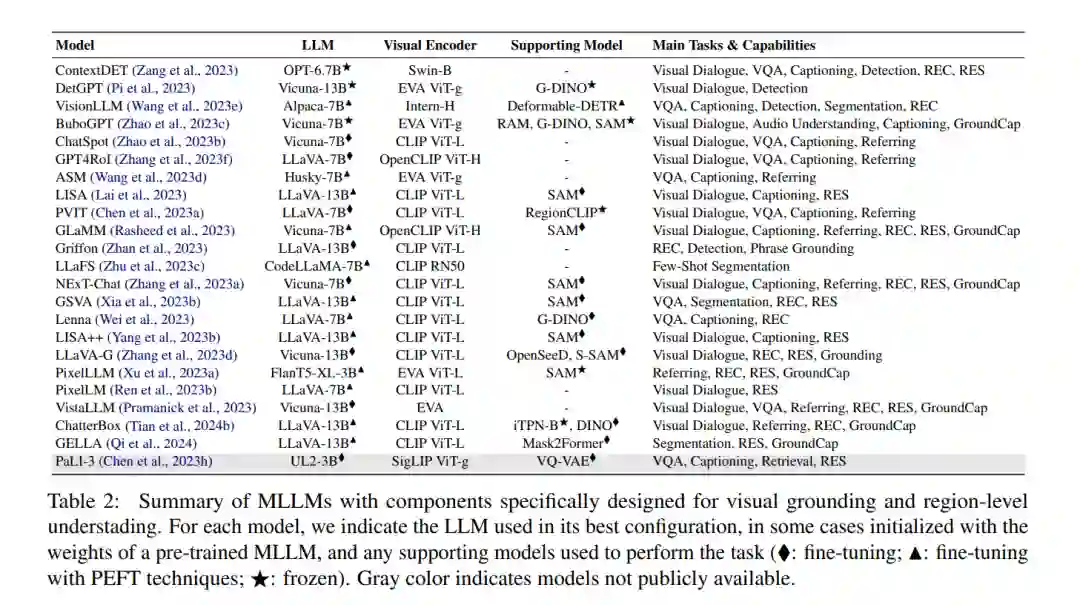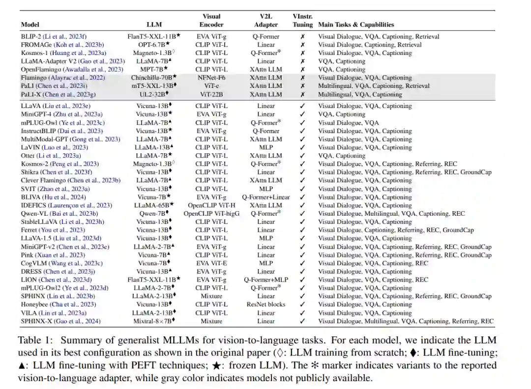 大型语言模型。Brown等人(2020)发现上下文学习,即在提示前附加一些示例以演示大型语言模型(LLM)的期望输出(Chowdhery等人,2023;Hoffmann等人,2022;Tay等人,2022),可以提高其性能,特别是在未见过的任务上。通过为每个训练样本提供所需任务的自然语言描述,可以进一步提高泛化能力。这种技术,称为指令调优(Chung等人,2022;Wang等人,2022b,a;Jiang等人,2024),对于使LLM的行为与人类的行为对齐至关重要,目前赋能了最先进的LLM,最终通过来自人类反馈的强化学习(RLHF)(Ouyang等人,2022;Achiam等人,2023;Chen等人,2023j;Bai等人,2023a)得到提升。PEFT。当一个预训练的LLM需要适应特定领域或应用时,参数高效微调(PEFT)方案代表了训练整个LLM的一个重要替代方案,因为这些策略只引入少量新参数。其中,提示调优(Hambardzumyan等人,2021;Lester等人,2021;Li和Liang,2021;Liu等人,2023j)学习一小组向量作为软提示在输入文本之前输入模型。不同的是,LoRA(Hu等人,2021)通过学习低秩矩阵限制了新权重的数量。这种技术与如QLoRA(Dettmers等人,2023)等量化方法正交,进一步减少了LLM的内存占用,与通常的半精度权重相比。走向多模态LLM。MLLM的发展与LLM的发展路径类似,Flamingo(Alayrac等人,2022)是首个在视觉-语言领域探索大规模上下文学习的模型。然后,视觉指令调优(Liu等人,2023e)迅速成为多模态领域中最突出的训练范式,以及使用PEFT技术微调LLM。任何MLLM至少包含三个组件(图1):作为与用户接口的LLM主干,一个(或多个)视觉编码器,以及一个或多个视觉到语言的适配器模块。对LLM主干的流行选择通常属于LLaMA家族(Touvron等人,2023a,b),鉴于它们的权重是自由可获取的,它们仅在公开数据上进行了训练,并且它们拥有不同的大小以适应各种用例。此外,它们的衍生版本也很受欢迎,例如Alpaca(Taori等人,2023)和Vicuna(Chiang等人,2023)。前者在GPT-3编写的指令上微调LLaMA,而后者利用用户与ChatGPT(OpenAI,2022)的共享对话。其他选择包括OPT(Zhang等人,2022b),Magneto(Wang等人,2023b),MPT(MosaicML,2023),以及经过指令调优(Chung等人,2022)或多语言(Xue等人,2020)版本的T5(Raffel等人,2020),一种为多个任务预训练的编解码器语言模型。 本调查中涵盖的MLLM的总结报告在表1中,指出每个模型基于哪个LLM,视觉编码器,用于连接视觉和语言组件的适配器,MLLM是否经过视觉指令调优训练,以及主要任务和能力的简短列表。视觉编码器在MLLM中,一个关键组件是视觉编码器,它专门设计用于为LLM提供提取的视觉特征。通常采用冻结的预训练视觉编码器,同时只训练一个可学习的接口,将视觉特征与底层LLM连接起来。最常用的视觉编码器基于预训练的Vision Transformer(ViT)模型,具有CLIP-based目标,以利用CLIP嵌入的固有对齐。流行的选择包括CLIP(Radford等人,2021)的ViT-L模型,OpenCLIP(Wortsman等人,2022)的ViT-H主干,以及EVA-CLIP(Fang等人,2023)的ViT-g版本。CLIP和OpenCLIP编码器在从网络收集的图像上训练,采用对比方法对正确的图像-文本对进行对齐。相反,EVA-CLIP是一系列模型,提供了训练CLIP模型的实用有效解决方案。特别是,EVA模型预训练为重建被遮挡的图像-文本对齐视觉特征,条件是可见的图像块。 正如(Li等人,2023f)所示,更强大的图像编码器导致更好的性能。基于这一见解,Lin等人(2023b)和Gao等人(2024)提出了一个冻结视觉主干的集合,以捕获鲁棒的视觉表示和不同级别的信息粒度。同时,PaLI模型(Chen等人,2023i,g),注意到语言和视觉参数之间的不平衡,分别提出将视觉主干扩展到4亿和220亿参数的ViT。使用如此大且强大的模型是通过在训练期间保持视觉编码器冻结的常见做法变得可行的,如(Li等人,2023f;Huang等人,2023a;Gao等人,2023;Chen等人,2023f)中所观察到的。然而,使用冻结的视觉编码器有一些局限性,主要是由于参数数量有限,导致视觉和语言模态之间对齐不足。具体来说,从视觉模型提取的密集特征可能会碎片化细粒度图像信息,并由于输入语言模型的长序列而带来大量计算。为了缓解这个问题,其他方法(Ye等人,2023c,d)采用两阶段训练范式。在第一阶段,他们结合了可训练的视觉主干,同时保持预训练的LLM冻结。根据他们的发现,使视觉编码器可训练可以提高诸如视觉问题回答或视觉描述等任务的性能。然而,它可能导致其他任务的性能下降,表明一定程度的遗忘和对通用视觉表示的损害。