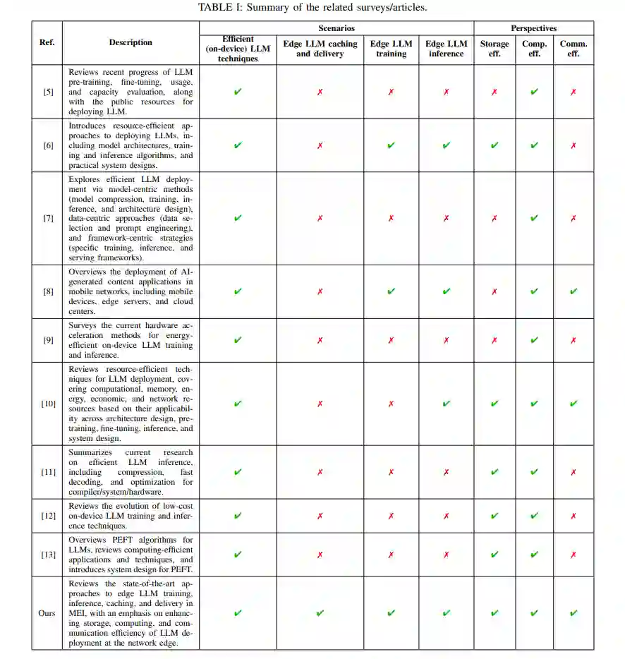 LLMs的部署比传统深度神经网络(DNNs)如卷积神经网络(CNNs)资源需求更高,这是将LLMs引入网络边缘的主要障碍。本调查论文旨在提供关于这一汇聚趋势(即MEI和LLMs)的当代调查,主要从资源高效部署的角度,包括网络边缘的存储效率、计算效率和通信效率。本论文不同于关于高效LLM训练/微调和推理的先前调查论文,如[5],[7],[9],[11]-[15]。这些论文大多关注于提高计算效率,而忽略了通信对LLM训练、推理和缓存交付的影响,这是移动边缘网络中的一个显著瓶颈。本论文还不同于现有的关于LLM边缘部署的调查/文章,如[6],[8],[10],[16]。这些论文探讨了云边协同的LLM赋能的AI服务提供,但没有讨论资源高效部署,如参数高效微调、分裂推理/学习和高效LLM缓存和交付及其与无线边缘网络的相互作用。最后,本调查论文与关于“用于网络的LLMs”[17],[18]的论文有根本不同,这些论文的设计目标是利用LLMs优化边缘网络,而不是利用边缘计算支持LLMs。与一些相关调查/论文的比较见表I。本论文的主要贡献总结如下: