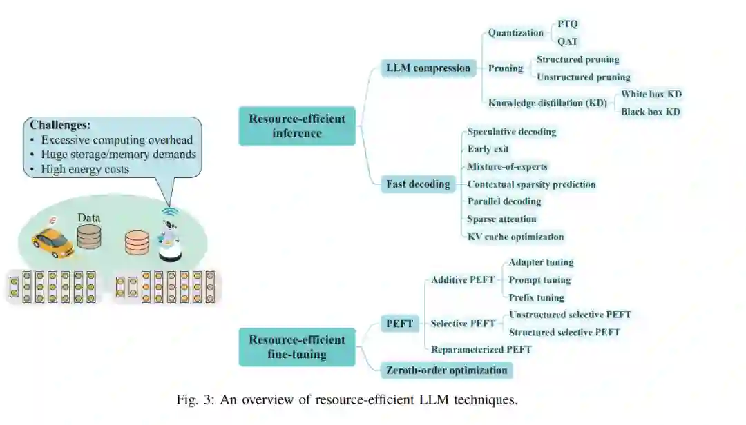 显然,MEI4LLM只是MEI的一个特殊案例。然而,在边缘训练和部署大量LLMs的需求可以成为MEI发展的关键动力。一方面,下一代MEI的原则,包括推动AI和通信的全面集成,与边缘LLMs的需求高度一致。另一方面,LLMs的极端资源需求推动了MEI的边界。具体而言,MEI4LLM必须具备以下特征:1)原生支持模型分割和跨互联边缘节点的并行训练/推理,以促进超大规模模型的部署;2)集成设计的无线网络和资源高效的LLM训练/推理技术,如参数高效微调和令牌(表示)缩减(将在第七节和第八节中介绍),以使LLMs的部署成本效益高。本质上,与传统MEI相比,MEI4LLM主要关注资源管理和高效AI技术的集成设计,以在有限的通信-计算资源下支持LLMs,这将是本调查论文的重点,也是该领域的研究主题。