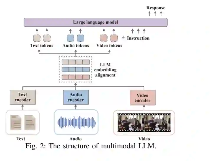 LLM架构可分为三类:仅编码器LLMs、编码器-解码器LLMs和仅解码器LLMs。仅编码器LLMs,如ALBERT [38],仅由编码器组件组成,通常基于高级架构如Transformer [19]。编码器负责处理输入序列,为每个令牌生成上下文化表示。尽管缺少用于生成输出序列的解码器,仅编码器LLMs在各种NLP任务中仍表现出色,如文本分类、句子相似度计算和语言理解,因其高效的特征提取能力和可适应的表示。编码器-解码器LLMs,以T5模型为代表[39],在NLP领域代表了一项重要进展,在其架构中集成了编码器和解码器组件。编码器处理输入序列以生成上下文化表示,而解码器利用这些表示生成输出序列,通常以序列到序列的方式。编码器-解码器LLMs广泛应用于机器翻译、文本摘要和问答等任务,因其捕捉复杂语言结构和上下文依赖关系的能力。仅解码器LLMs,以著名的GPT系列[34],[40]为代表,构成LLMs的一个重要分支。仅解码器LLMs采用自回归解码,这在仅解码器和编码器-解码器LLMs中广泛使用,根据序列中的先前令牌生成输出序列。这种架构设计使其特别适合于生成文本的任务,如语言生成、文本补全和对话响应生成。3) 多模态LLMs:由于传统LLMs [41]-[43]主要应用于文本数据,对LLMs的单模态模型训练限制了它们理解超越文本的其他数据类型的能力。例如,传统的LLMs如GPT-3和BERT [23]仅依赖于文本输入。然而,在许多现实场景中,语言理解不仅限于文本上下文,还包括视觉线索、听觉信号和来自多种传感器的上下文感知信息。 为解决上述问题,学术界和工业界广泛研究了多模态LLMs的范式,如图2所示,将文本、图像和音频等各种模态融合到一个统一的框架中,释放处理多种数据类型的潜力。例如,GPT-4 [40]擅长同时处理图像和文本输入,在各种基准测试中展示了与人类相当的表现。在图像描述任务中,GPT-4利用图像和相关文本数据生成更精确和生动的描述,而在语音识别任务中,它将语音信号与文本信息结合以改进语音理解和转换。多模态感知在追求通用AI中起着关键作用,因为处理复杂的现实数据需要能够跨模态信息融合和交互学习的AI模型,从而提升多个感知领域的训练性能。