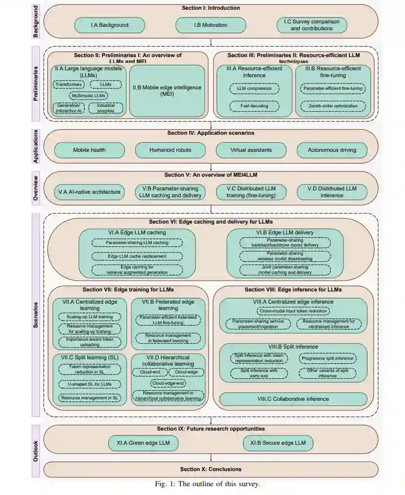如图1所示,调查的组织结构如下。第二节概述LLMs和MEI,第三节介绍最新的资源高效LLM技术。第四节展示了四个关键应用,证明在网络边缘部署LLMs的必要性。在第五节中,我们提出了支持LLMs在网络边缘部署的MEI4LLM框架。该框架包括AI原生架构、参数共享LLM缓存和交付、分布式LLM训练/微调和分布式LLM推理。第六、七、八节分别探讨了考虑存储效率、计算效率和通信效率的高效边缘LLM缓存和交付、边缘LLM训练和边缘LLM推理技术。最后,我们在第九节概述未来研究机会,并在第十节给出结论。