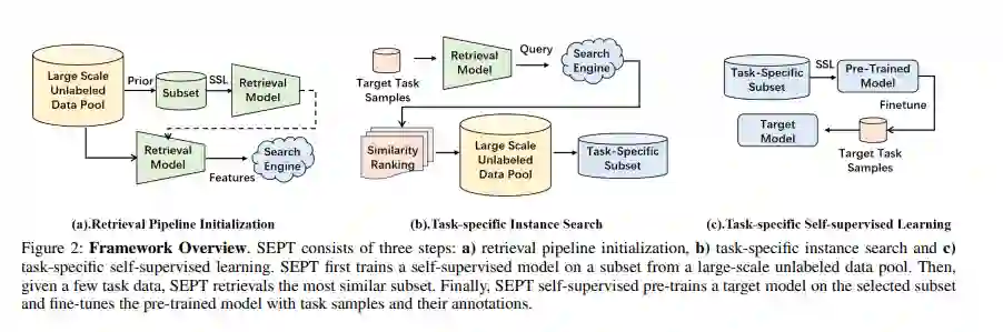 最近,自监督预训练范式在利用大规模无标记数据来提高下游任务性能方面显示出了巨大的潜力。然而,在现实场景中增加无标记预训练数据的规模,需要惊人的计算成本,并面临着未经策划的样本的挑战。为解决这些问题,本文从数据选择的角度构建了一个特定于任务的自监督预训练框架,基于一个简单的假设,对与目标任务分布相似的未标记样本进行预训练,可以带来实质性的性能提升。在该假设的支持下,通过引入数据选择的检索管道,提出了第一个可扩展和高效的视觉预训练(SEPT)的新框架。首先利用自监督预训练模型提取整个未标记数据集的特征,用于检索管道初始化;然后,针对特定的目标任务,基于每个目标实例的特征相似度,从无标记数据集中检索最相似的样本进行预训练;最后,使用选取的无标签样本对目标模型进行自监督预训练,实现目标数据微调。通过解耦预训练规模和目标任务的可用上游数据,SEPT实现了上游数据集的高可扩展性和预训练的高效性,从而实现了高模型架构灵活性。在各种下游任务上的结果表明,与ImageNet预训练相比,SEPT可以实现具有竞争力甚至更好的性能,同时将训练样本的大小减少一个量级,而不需要借助任何额外的注释。