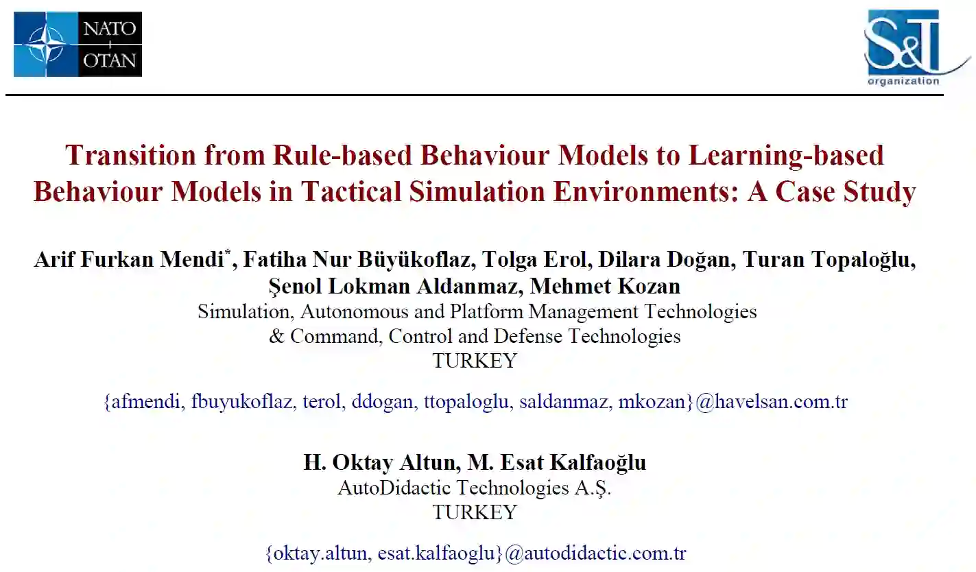 为了这个目的,在这项研究中(即FIVE-ML),已经实现了从HAVELSAN FIVE软件的基于规则的行为模型向基于RL的行为模型过渡的第一阶段实验。从这些实验中可以看出,用RL算法训练的智能虚拟实体在空对空和空对地的情况下都优于HAVELSAN现有的基于规则的实体。此外,模仿学习[16]、[17]和RL的联合实施也取得了成功,这加快了FIVE软件的完整过渡过程。