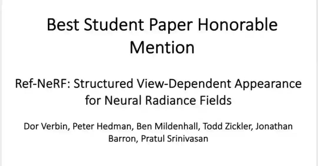 今年的最佳学生论文提名由哈佛大学和谷歌研究院的论文《Ref-NeRF: Structured View-Dependent Appearance for Neural Radiance Fields》获得。
