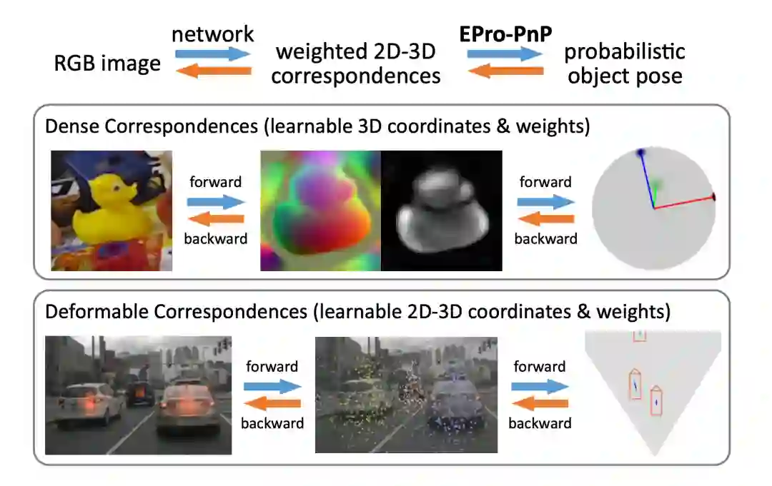 这篇论文提出了一种用于普遍端到端姿态估计的概率 PnP 层——EPro-PnP(end-to-end probabilistic PnP),它在 SE 流形上输出姿态的分布,实质地将分类 Softmax 带入连续域。2D-3D 坐标和相应的权值作为中间变量,通过最小化预测姿态与目标姿态分布之间的 KL 散度来学习。其基本原理统一了现有的方法,类似于注意力机制。EPro-PnP 的性能明显优于其他基准,缩小了基于 PnP 的方法与基于 LineMOD 6DoF 的姿态估计以及 nuScenes 3D 目标检测基准的特定任务方法之间的差距。