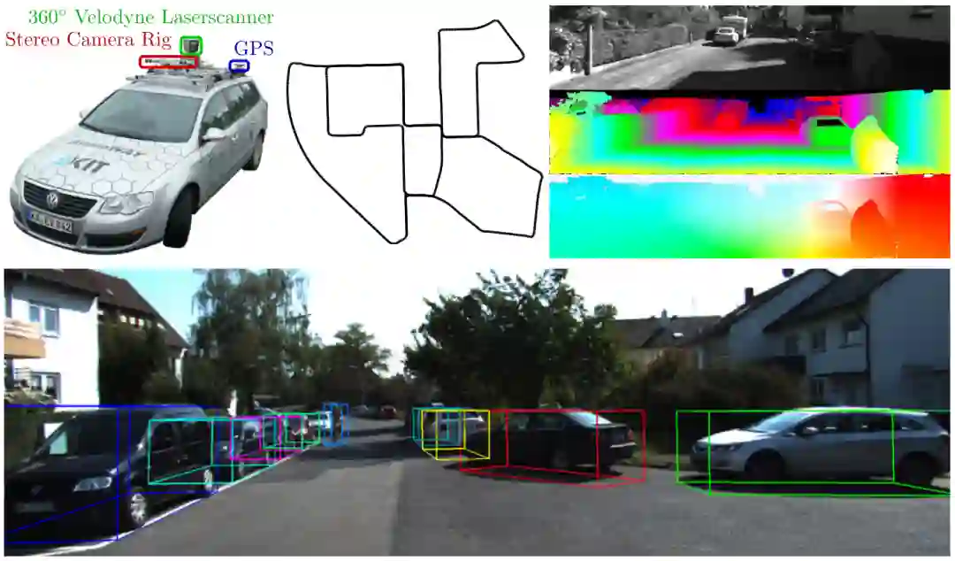 左上为配备了传感器的记录平台,中上为来自研究者视觉测程基准中的轨迹、右上为视差和光流图、下方为 3D 目标标签。