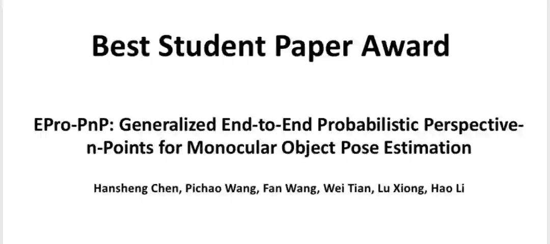 今年获得最佳学生论文奖项的是《EPro-PnP: Generalized End-to-End Probabilistic Perspective-n-Points for Monocular Object Pose Estimation》,作者来自阿里巴巴、同济大学。
