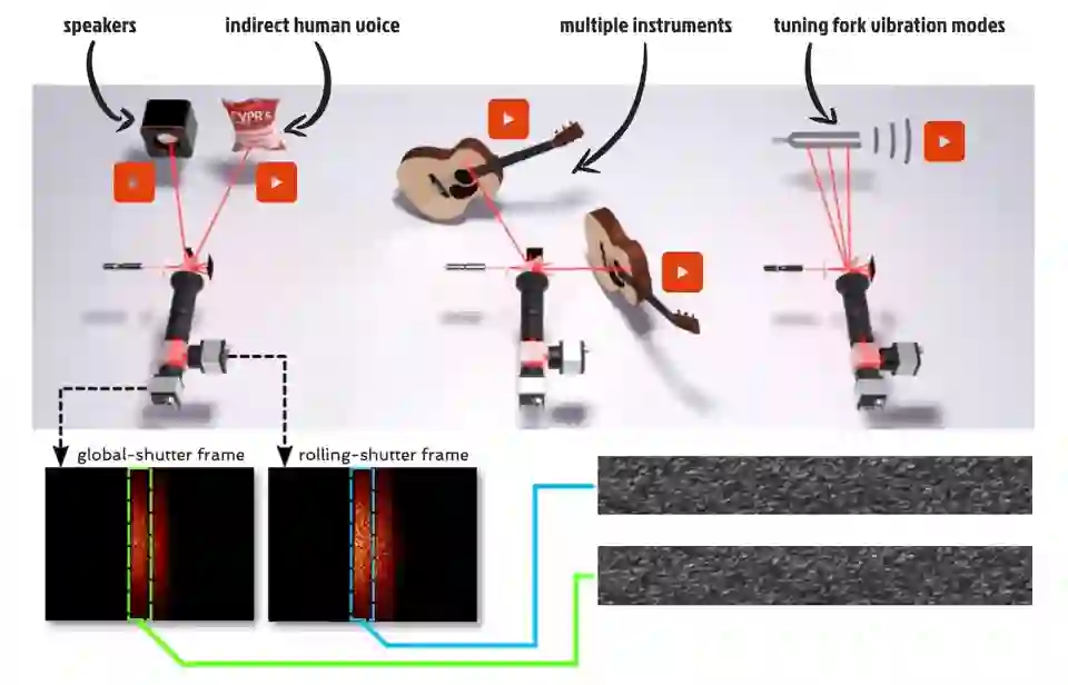 论文摘要:视觉振动测量是一种非常有用的工具,可用于远程捕捉音频、材料物理属性、人体心率等。虽然视觉上可观察的振动可以通过高速相机直接捕捉,但通过将激光束照射振动表面所产生的散斑图案的位移成像,可以从光学上放大微小且不易察觉的物体振动。 在本文中,研究者提出了一种在高速(高达 63kHz)下同时检测多个场景源振动的新方法,该方法使用了额定工作频率仅为 130Hz 的传感器。他们的方法使用两个分别配备滚动和全局快门传感器的相机来同时捕捉场景,其中滚动快门相机捕捉到对高速物体振动进行编码的失真散斑图像,全局快门相机捕捉散斑图案的未失真参考图像,从而有助于对源振动进行解码。最后,研究者通过捕捉音频源(如扬声器、人声和乐器)引起的振动并分析音叉的振动模式,展示了他们的方法。