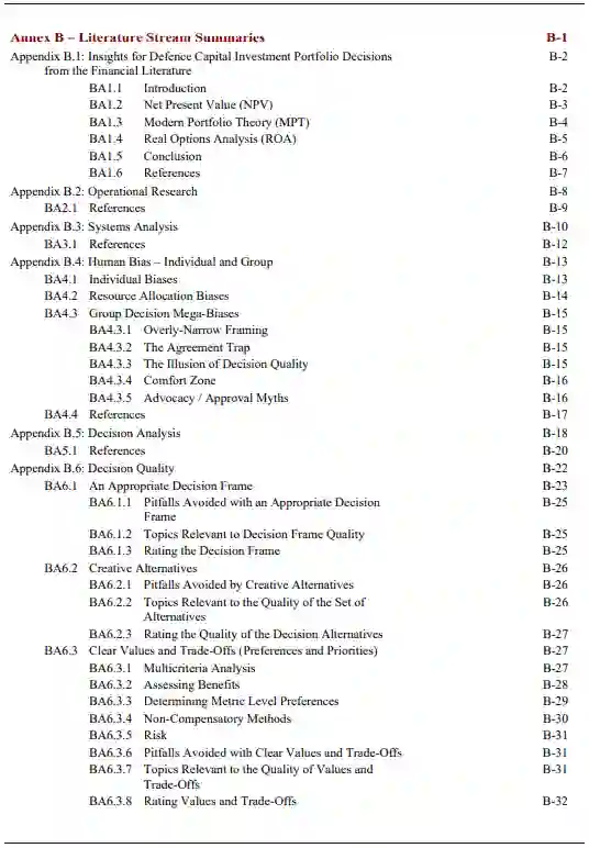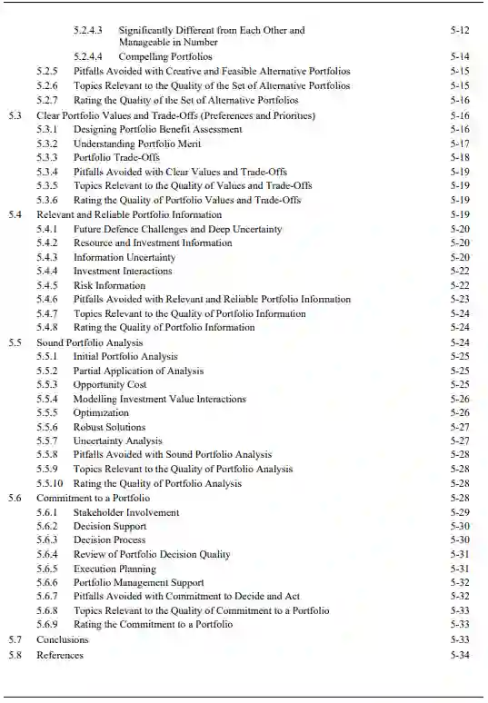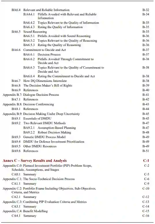 为了寻求能够帮助各国改进DIP决策并实现最佳的国家和联盟结果的最佳做法,对一些文献进行了研究。在探索金融投资、运筹学(OR)、系统分析(SA)、决策分析(DA)、个人和团体偏见以及深度不确定性下的决策(DMDU)的相关文献之前,审查包括DIP的道德、政策发展、能力发展和成本计算基础。这包括对先前北约SAS研究和具体军事应用的审查。我们发现,大多数关于资本投资优先次序的OR文献中的假设与DIP决策中的假设之间似乎并不匹配。OR文献一直将DIP表述为寻找最佳的数学算法来从头构建一个最佳的投资组合,在很大程度上忽略了各种现实世界的限制因素,包括公共问责制的动态、政府程序、工业基地利益、国际竞争或伴随国防投资组合决策的取消的政治成本。DA文献提供了一个更广泛的处理方法,明确容纳了决策复杂性的这些和其他方面。最早在美国发展起来的系统分析文献特别关注DIP决策,而DMDU的文献则涉及未来不确定性的复杂性质。从这个文献搜索中,我们发现DA的 "决策质量"(DQ)框架对一个好的决策所需的所有方面提供了一个实用的和经过验证的提炼,并注意到它与SA的宗旨密切对应。DQ框架提供了一套六种观点,各国可以通过这些观点审查和评估自己的决策过程,包括那些与DIP有关的决策。