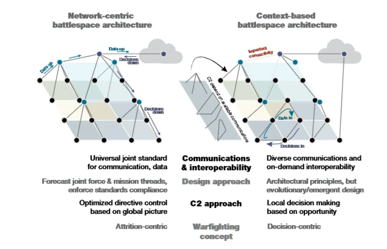 网络视角:要实现可选择性和实施以决策为中心的战争,就需要有能力使C2结构与现有通信保持一致,而不是试图建立一个在面对敌方协同干扰和物理攻击时仍能生存的网络。这些需求导致了一种混合架构,这种架构将网络方式与分层方式结合起来,可以被定性为 "异构"。这种拓扑结构将使指挥权与合格的人类操作者占据的节点中具有最高程度的节点相一致。