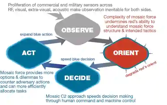 马赛克战争提出了一种部队设计和指挥控制(C2)程序,与今天的美军相比,它将使美军能够执行更多、更多样化的行动方案(COA)。马赛克部队的分解结构和使用人类指挥与机器控制,将使对手的决策复杂化,缩小其选择范围,并施加一系列可能无法解决的困境。通过增加美军指挥官的选择权,减少敌方的选择权,马赛克战法将寻求获得“选择权优势”,使美军能够做出更快、更有效的决策。