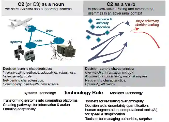 用于以决策为中心的战争的C3能力需要做的不仅仅是实现连接。例如,C2工具将需要生成能创造和维持可选择性的COA,以提高适应性,并将复杂性强加给对手。为了帮助初级领导人执行任务指挥,C2工具还需要了解哪些单位在通信中,他们在潜在的COAs中的作用,并配置网络以确保所需单位与适当的指挥官保持一致。为了评估这些要求和以决策为中心的C3的其他要求,本研究采用了多种视角,如下所述。