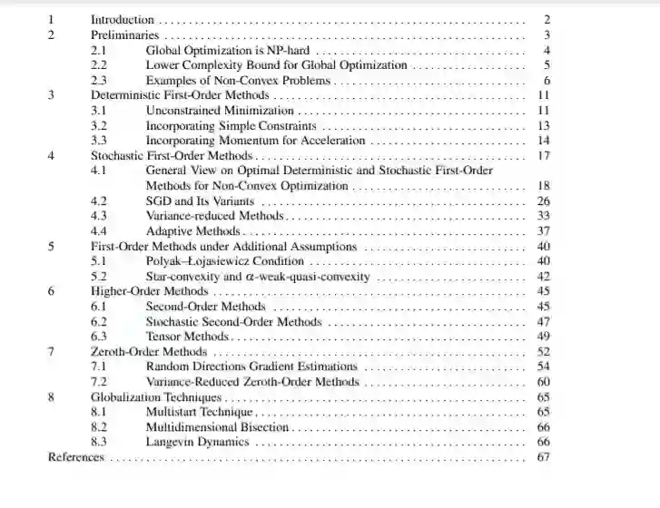 基于最近关于非凸优化算法在训练深度神经网络和数据分析中的其他优化问题中的应用,我们对非凸优化算法全局性能保证的最新理论成果进行了综述。我们从经典的论证开始,证明一般的非凸问题不可能在合理的时间内得到有效的解决。然后,我们给出了一个可以通过尽可能多地利用问题的结构来寻找全局最优解的问题列表。处理非凸性的另一种方法是将寻找全局最小值的目标放宽到寻找一个平稳点或局部最小值。对于这种设置,我们首先给出确定性一阶方法收敛速度的已知结果,然后是最优随机和随机梯度格式的一般理论分析,以及随机一阶方法的概述。然后,我们讨论了相当一般的一类非凸问题,如α-弱拟凸函数的极小化和满足Polyak- Lojasiewicz条件的函数,这些函数仍然可以得到一阶方法的理论收敛保证。然后我们考虑非凸优化问题的高阶、零阶/无导数方法及其收敛速度。