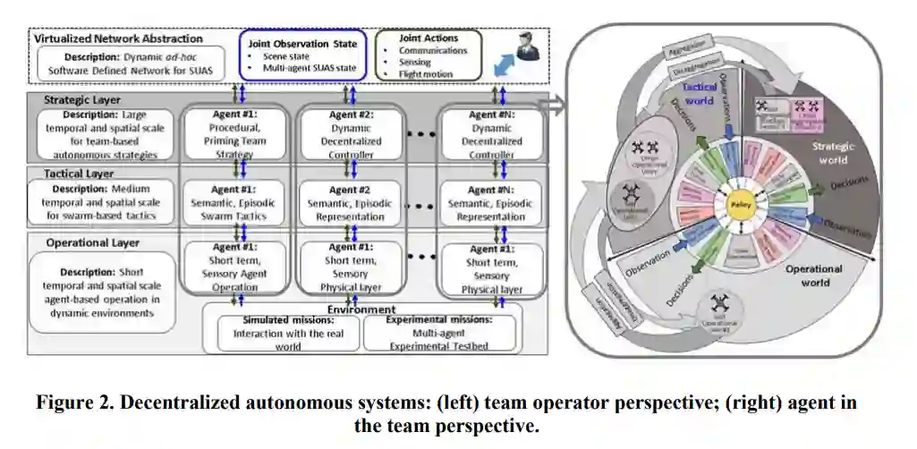 与验证SUAS团队有关的工作提出并实验测试了我们的态势感知、分布式SUAS团队所使用的框架,该团队能够以自主方式实时运行,并在受限的通信条件下运行。我们的框架依赖于三层方法:(1)操作层,在这里做出快速的时间和狭窄的空间决定;(2)战术层,在这里为智能体团队做出时间和空间决定;以及(3)战略层,在这里为智能体团队做出缓慢的时间和广泛的空间决定。这三层由一个临时的、软件定义的通信网络协调,即使在通信受限的情况下,也能确保各层的智能体小组和团队之间的信息传递稀少而及时。实验结果显示,一个由10个小型无人机系统组成的团队负责在一个开放区域搜索和监测一个人。在操作层,我们的用例介绍了一个智能体自主地进行搜索、探测、定位、分类、识别、跟踪和跟踪该人,同时避免恶意碰撞。在战术层,我们的实验用例介绍了一组多个智能体的合作互动,使其能够在更广泛的空间和时间区域内监测目标人物。在战略层,我们的用例涉及复杂行为的检测--即被跟踪的人进入汽车并逃跑,或者被跟踪的人离开汽车并逃跑--这需要战略反应以成功完成任务。