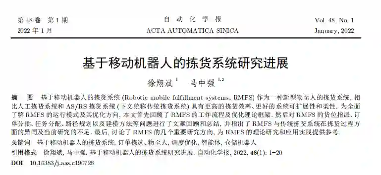 基于移动机器人的拣货系统(Robotic mobile fulfillment systems, RMFS)作为一种新型物至人的拣货系统, 相比人工拣货系统和AS/RS拣货系统(下文统称传统拣货系统)具有更高的拣货效率、更好的系统可扩展性和柔性. 为全面了解RMFS的运行模式及其优化方向, 本文首先回顾了RMFS的工作流程及优化理论框架, 然后对RMFS的货位指派、订单分批、任务分配、路径规划以及建模方法等问题进行了文献回顾和总结, 并指出了RMFS与传统拣货系统在拣货过程方面的异同及当前研究的不足. 最后, 讨论了RMFS的几个重要研究方向, 为RMFS的理论研究和应用实践提供参考.