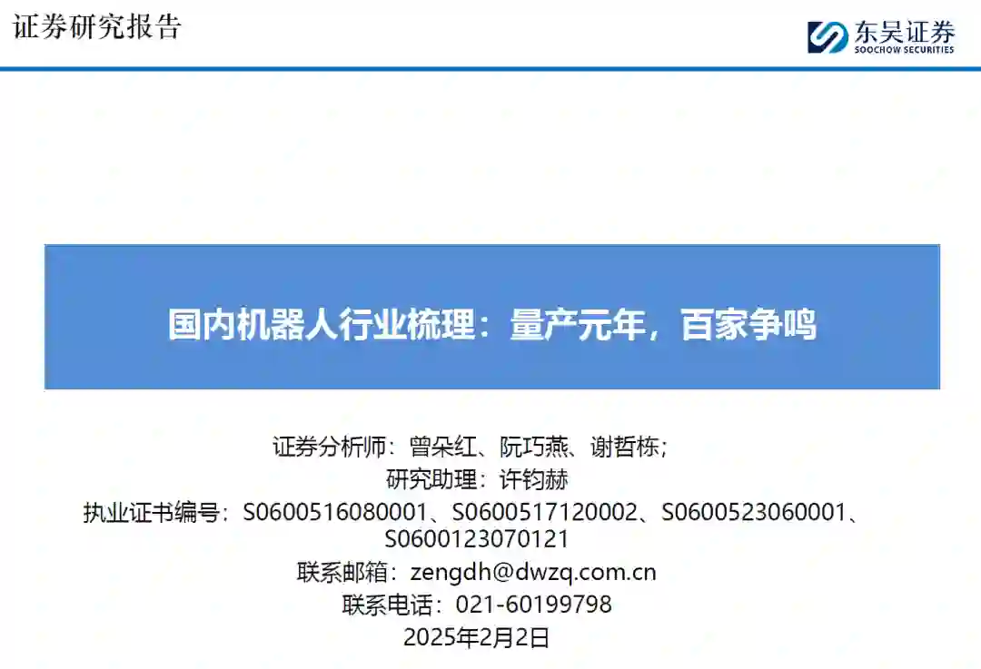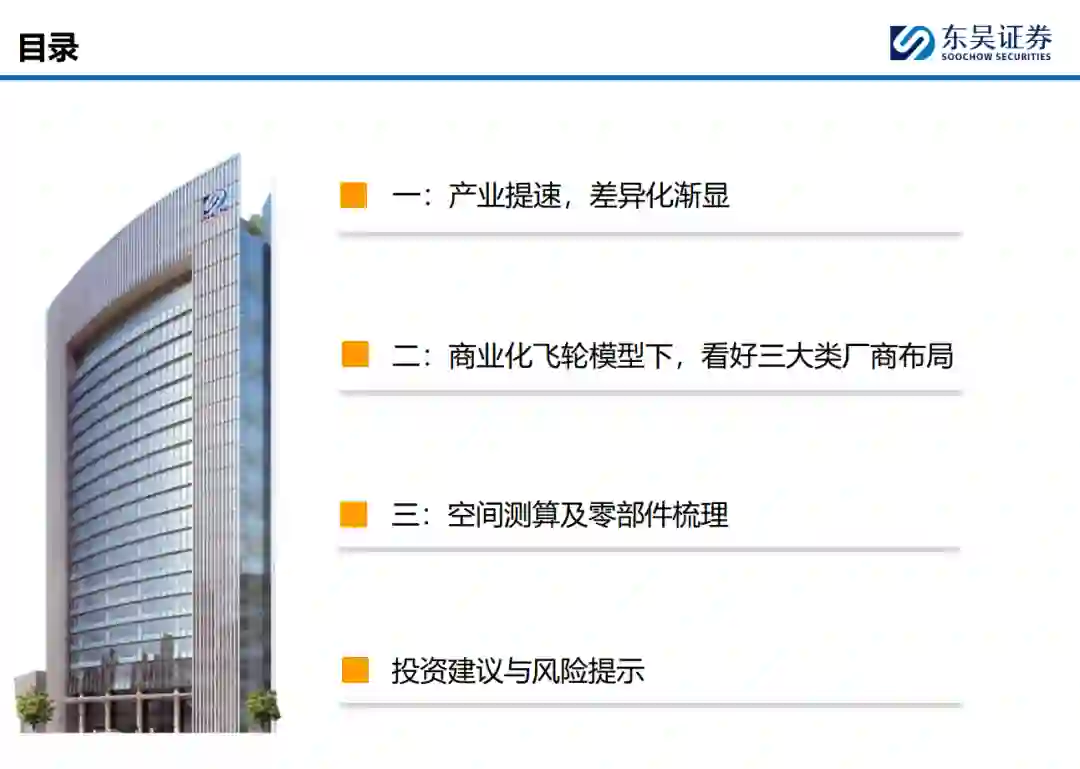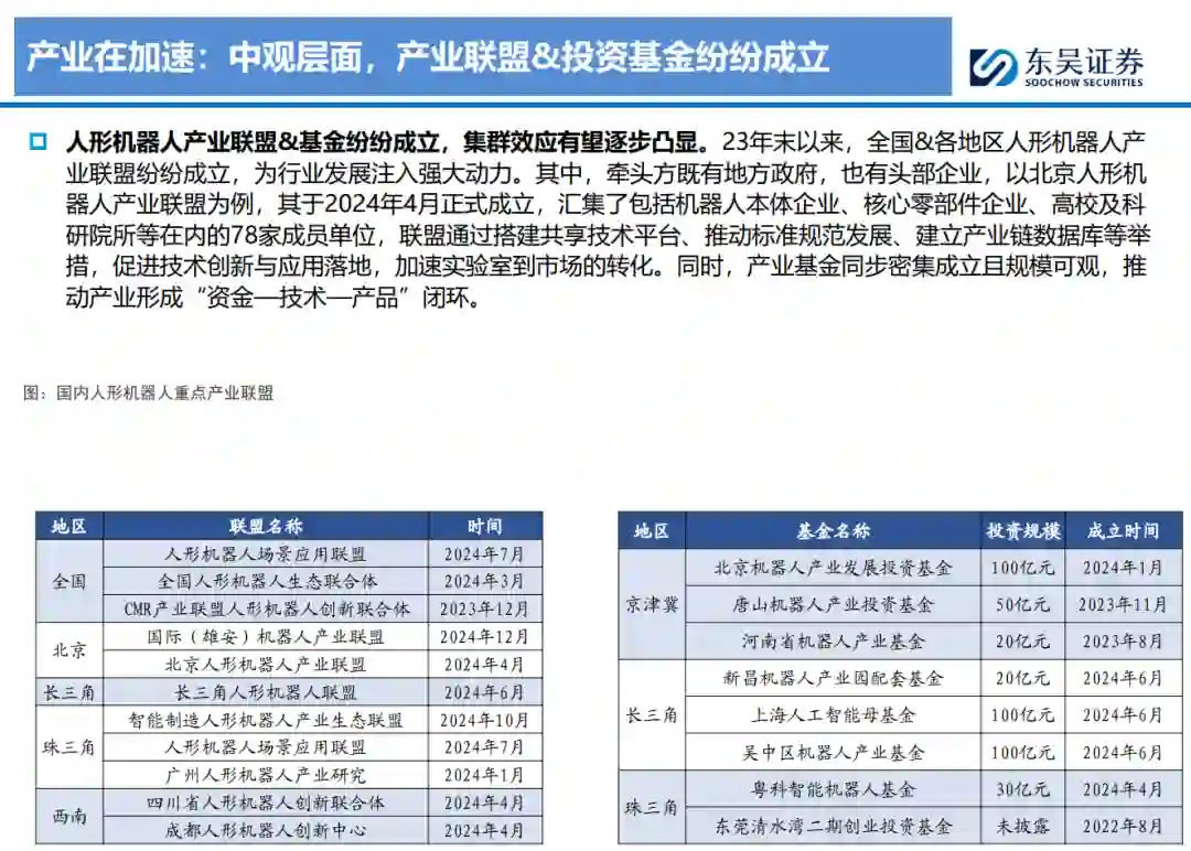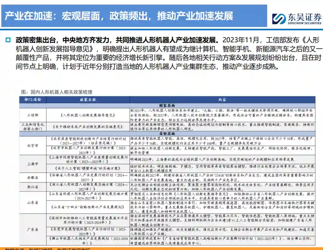产业明显提速,差异化渐显,短期工业场景有望率先落地,长期空间广阔。1)产业在加速:产业政策密集出台,产业联盟&基金纷纷成立,融资数量大幅增长,推动产业形成“资金—技术—产品”闭环。2)差异化渐显:国内机器人在上下肢、视觉等硬件方案及模型路线等软件层面存在差异化且仍未收敛。3)短期爆发在即,长期空间广阔:应用环节较为明确为汽车、3C行业,有望率先起量,逐步延伸至其他制造业及搬运、零售等服务业,有望于2030年走进家庭。据测算,预计2030/2035年机器人新增需求达178/994万台。随大脑逐步完善及场景拓宽,关节数增加,线性关节逐步渗透,灵巧手收敛至五指方案,我们测算2035年大批量生产后,单体执行器价值量约6万元,旋转/线性执行器市场空间达2130/4031亿元。 初创机器人企业:背景多元,量产在即,潜力无限。我们梳理了智元、宇树、优必选、乐聚、普渡、傅利叶、银河通用、众擎、星动纪元、千寻智能共10家企业,初创企业机制较为灵活,创始团队在某一领域(运动控制为主)背景深厚,2024年头部企业均发布最新机型,具备双足机器人的开发能力,并与车企等制造企业试点近半年,小批量测试阶段有望结束,25年开启量产销售,多家企业预计2025年全年销售超千台。我们认为:1)智元、宇树、优必选、乐聚进度较为领先,在全栈式布局、硬件性能&成本控制、场景应用、股东背景等领域具备优势;2)银河通用、星动纪元、众擎、千寻智能则在大模型、运动控制算法等细分方向较为领先;3)普渡、傅利叶由原本配送/康复机器人拓展,硬件&量产能力优秀。 互联网&整车企业:多元形式入局,推动产业加速。1)互联网企业:多以投资&大模型&自研方式入局,关注软件端的大模型高于关注硬件,从“大脑”方面发力。目前国内互联网企业多集中于语言模型,也纷纷推出自研多模态大模型,也在往具身智能大模型方向发展,但与海外龙头企业仍有一定差距。其中,华为布局较为多样,模型端—盘古大模型较为领先,志在让人形机器人成为鸿蒙生态系统重要部分,车端—场景&制造资源协同,共同赋能国产人形机器人,投资端—注资极目机器人,加大投入。3)整车企业:人形机器人在“感知+决策+执行”层面与智能驾驶均具备共同性,同时车企在应用端也是天然的落地场所,目前在智能驾驶投入层面华为于研发人员&算力规模均国内第一,有望于人形机器人领域延续领先地位。