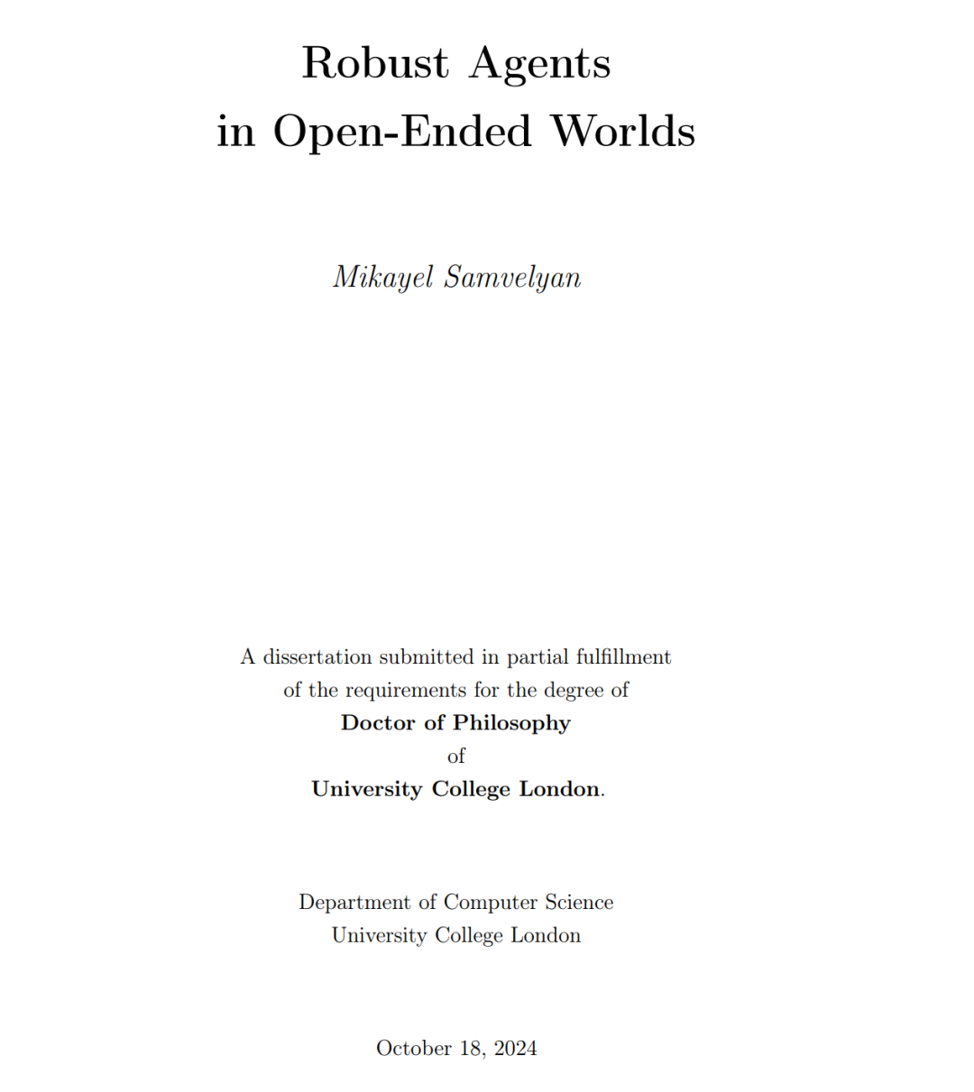 接着,我们在多智能体领域进一步探究鲁棒性,采用质量-多样性(quality-diversity)方法系统地识别复杂足球电子游戏领域中最先进的预训练 RL 策略的脆弱性。该领域兼具协作与对抗动态,使得策略的鲁棒性分析更加具有挑战性。最后,我们将鲁棒性研究扩展至大型语言模型(LLMs)。在这一部分中,我们重点诊断并提升 LLM 面对对抗提示(adversarial prompts)时的鲁棒性,通过进化搜索生成多样且有效的输入,以诱导 LLM 产生不期望的输出。