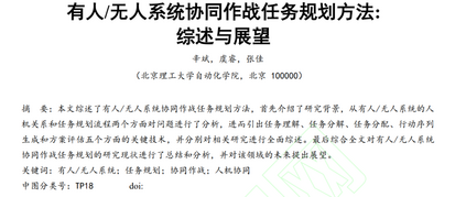 本文综述了有人/无人系统协同作战任务规划方法,首先介绍了研究背景,从有人/无人系统的人 机关系和任务规划流程两个方面对问题进行了分析,进而引出任务理解、任务分解、任务分配、行动序列 生成和方案评估五个方面的关键技术,并分别对相关研究进行全面综述。最后综合全文对有人/无人系统 协同作战任务规划的研究现状进行了总结和分析,并对该领域的未来提出展望。随着人工智能和人机共融技术的快速发展,有 人/无人系统协同作战成为作战研究领域的一大热 点,正在加速改变体系作战模式和战争形态。无人 系统因其低成本、无伤亡、高机动的特性,能够在 恶劣的环境下代替人类执行危险、繁琐的任务,但 其当前的智能化水平还无法适应战场环境的动态不确定性以及任务的复杂性,而融入人的智慧和综 合判断能力的有人系统有效弥补了这个缺陷。将二 者有机结合,有人/无人系统协同作战理念应运而生, 将逐渐成为未来战争中的主流样式。 近年来世界各军事强国充分利用有人系统和 无人系统的优势,围绕最大发挥有人/无人系统综合 作战效能的目标开展了大量研究。在政策层面,美 国国防部在 2014 年发布了《无人系统综合路线图 ( 2013-2038 ) 》 , 把 有 人 / 无 人 系 统 编 组 (Manned-Unmanned System Teaming,MUM-T)列 为重点关注的五个主题之一。在项目实施层面,英 国国防部和 QinetiQ 公司于 2007 年用一架“狂风”综 合航空电子研究样机(TIARA)作为指控飞机与三 架仿真无人机进行编队飞行实验,实现了有人战机 中一位飞行员直接控制 4 架飞机对地攻击的过程。 而最具代表性的研究始于 2015 年美国国防部提出 的“忠诚僚机”概念,针对这一概念,美国空军研究 实 验 室 和 克 瑞 托 斯 防 务 公 司 联 合 开 发 了 XQ-58A“女武神”无人机,并于 2020 年成功与 F-22 和 F-35 有人机一起进行了半自主飞行试验。 从作战过程的主要阶段进行分析,有人/无人系 统协同作战研究涉及到协同感知、认知、决策和控 制等方面,其中任务规划作为协同决策技术的中心 环节和发挥协同作战效能的关键环节,能够衔接作 战构想与作战任务的落实执行,实现对作战资源的 配置优化,提供科学准确的作战方案与计划[1]。与 纯无人系统相比,有人/无人作战体系规模大、成 员异构多样,特别是有人平台的加入增强了系统之 间的耦合性,其任务规划建模过程需考虑人机配比、 人机分工等因素,使得问题更加复杂。只有将人和 机器的能力、有人系统和无人系统的能力以及其内 部的相互关系充分体现出来,才得以更好地契合实 际作战场景。 各军事强国对有人/无人系统协同作战的任务 规划能力高度重视,视之为实现杀伤链快速闭合的 关键力量。当前与有人/无人系统协同作战任务规划 相关的文献主要以研究型论文为主,而综述论文鲜 有发表。鉴于此,本文从概念分析、协同模式和关 键技术三个方面对有人/无人系统协同作战的任务 规划方法进行了全面综述,对已有研究成果进行综 合分析并提出未来展望,旨在为该领域的研究人员 提供参考。在文献检索阶段,本研究主要依托中国 知网全文数据库,辅以 EI 数据库和 WOS 平台进行 交叉检索,以确保检索结果的全面性。