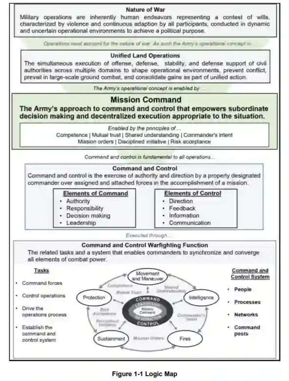 本出版物根据指挥与控制的作战职能进行了更新,而以前的版本是在理论上仍然提到任务指挥作战职能的时候编写的。指挥与控制是指适当指定的指挥官在完成任务的过程中,对指派的和附属的部队行使权力和指导(参考JP 1)。陆军将任务指挥定义为陆军的指挥和控制方法(也称为C2),它赋予下属决策权和适合情况的分布式执行权(ADP 6-0)。为了协助指挥部队和控制行动,指挥官建立了他们的指挥和控制系统,即人员、程序、网络和指挥所的安排,使指挥官能够开展行动(ADP 6-0)。有效的指挥官使用本出版物来提高他们的指挥和控制系统的准备状态,以确保他们的部队准备好进行统一的地面行动。