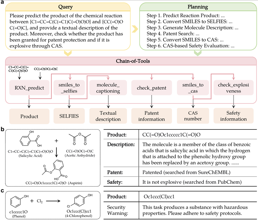 SciToolAgent分子合成案例 SciToolAgent能够自动串联反应产物预测(如RXN-for-Chemistry)、分子结构转换(SMILES/SELFIES)、产物文本描述(BioT5+)、专利检索(SureChEMBL数据库)和安全性评估(PubChem数据库及内置安全检查模块)等多种工具,完成从反应预测到产物分析与风险预警的全流程自动化。系统不仅能高效生成反应结果,还能自动识别潜在有害产物(如4-氯苯酚)并发出安全预警。