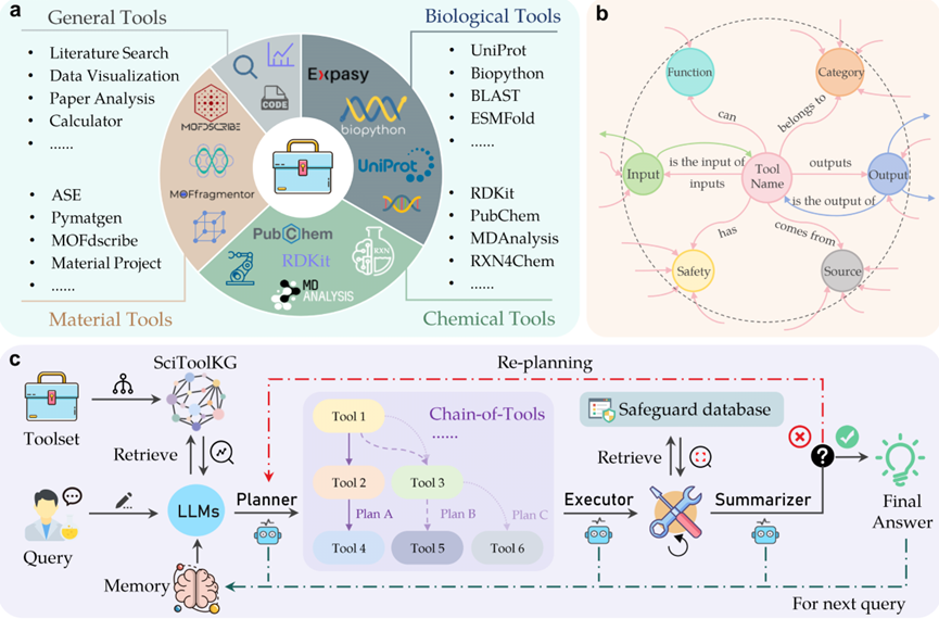 在生物、化学、材料等领域,科学研究日益依赖于各种专业计算工具。然而,面对数量庞杂的工具和复杂的科学问题,如何让非计算机专业背景的研究者也能高效、可靠地完成任务,成为亟需解决的难题。近日,浙江大学研究团队提出的SciToolAgent,为此提供了全新的智能解决方案。SciToolAgent利用知识图谱的结构化信息,增强大模型智能体对于复杂任务规划能力,提高其调用科学(包括生物、化学、材料等)工具的准确性,在蛋白质设计、化学反应预测、分子合成、MOF材料筛选等广泛的场景进行了验证。近日该工作已被《Nature Computational Science》接收。