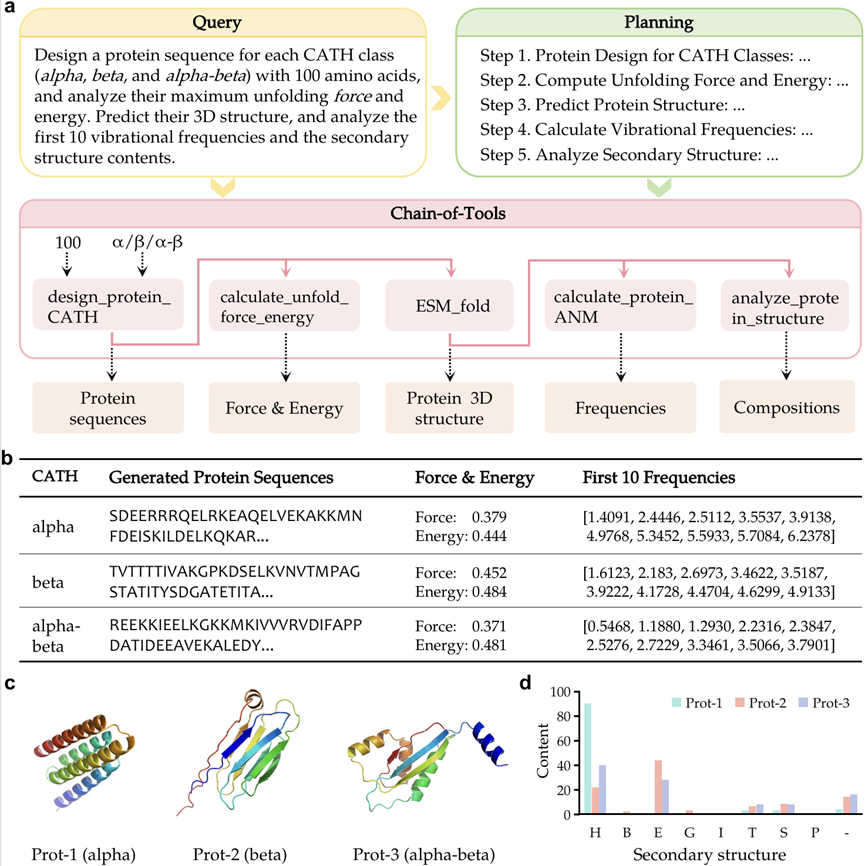 SciToolAgent蛋白质设计案例 SciToolAgent自动生成的工具链包括:蛋白序列生成(design_protein_CATH)、结构预测(ESM_fold)、力学与动态稳定性分析(calculate_unfold_force_energy ...)等关键环节,无需人工干预,实现高效、全流程的蛋白设计与分析。
