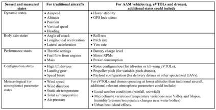 感知是继传感之后的更高层次的过程。它涉及对传感器收集和预处理(在一定程度上)的数据进行解释和理解。感知算法和系统将来自不同传感流的数据结合起来并进行分析,以识别和辨认物体、障碍物、地形、地标以及环境中的其他相关特征。感知还包括估计这些物体的相对位置和速度,确定其对飞行安全和导航的重要性,并预测其未来的移动[45]。吸收有关车辆自身状态的数据也是感知过程的一部分。从本质上讲,感知使自主系统能够了解其周围环境、相对于周围环境的相对位置和状态,并在此基础上做出明智的决策。下表简要列出了各种状态变量和参数,这些变量和参数被感知、测量并最终输入感知模块。