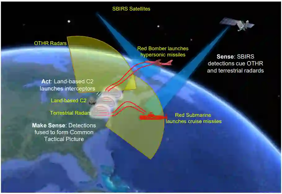 这一场景涉及与其他设想类似的传感器管理、数据融合和威胁应对能力,但值得注意的是,它提出了一个分层传感架构,其中不同类型和不同能力的多个传感器以互补的方式被采用。这种分层传感架构的想法是许多现代防御概念的核心,但需要进行复杂的分析,以确定最佳的架构(传感器的类型、传感器的安排以及每种类型的数量和能力)来应对一系列威胁。