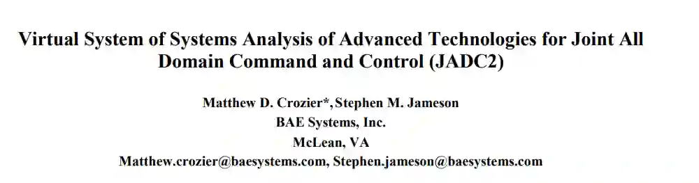 未来涉及全域联合指挥与控制(JADC2)的冲突将需要在多域(空间/空中/地面/海上)杀伤链中对传感、C2和目标资产进行整合和控制,并由自主、数据融合和人工智能等技术实现。为了支持关于在何处以及如何应用这些技术的决策,BAE系统公司开发了一个系统数字试验台,以实现对与基于模型的系统工程(MBSE)工具相结合的多领域系统的任务级分析。它提供了高保真性能分析模拟所缺乏的任务灵活性,同时允许纳入高级算法能力(如自主性、AI/ML),这在高水平的活动模拟或行动分析工具中是不可能的。该测试平台利用美国空军仿真、集成和建模高级框架(AFSIM)以及波西米亚互动的VBS4游戏引擎来模拟场景。信息管理框架使用通过VBS4模拟SDK提取的信息来模拟传感器、效应器和C2信息处理以及通过杀伤链的信息流。仿真套件符合DIS/HLA标准,允许纳入其他仿真以进一步提高逼真度,还提供了一个信息传递网关,允许以标准的C2和信息传递格式(如OMS/UCI)交换信息。至关重要的是,信息管理层也允许灵活地纳入技术,以实现信息管理的自动化并增强C2过程。在本文中,我们描述了JADC2所带来的挑战,以及系统分析对先进算法技术应用的极端重要性。我们讨论了系统数字试验台的原理和结构、所采用的技术以及系统分析的方法。我们将介绍评估这些技术对改善任务级指标的系统贡献的结果,如延迟、可扩展性和杀伤链反应的稳健性。