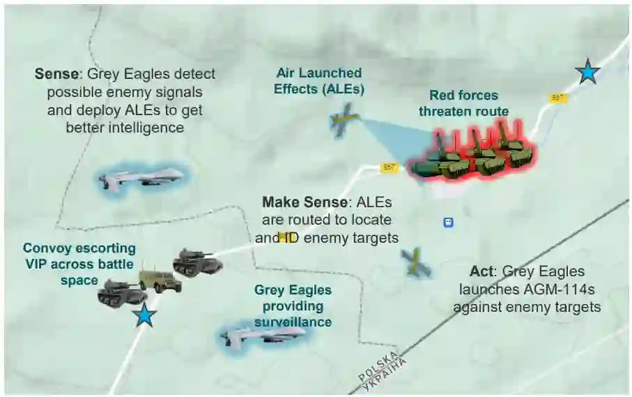 美国陆军正在为未来的空中/地面行动开发一个概念,涉及部署一系列空中发射效应(ALE)系统[9],这些无人机系统(UAS)可以从较大的有人或无人飞机上发射,例如陆军用于战场情报、监视和侦察(ISR)的灰鹰UAS。ALE以小组形式运作,不受人类控制,执行一系列的侦察和攻击任务,以支持陆军的空中和地面行动。ALE小组执行这些任务的能力的核心是使用基于人工智能的算法来认识和了解情况,评估和分配ALE任务的目标,以及团队行动或集群来完成共享任务。