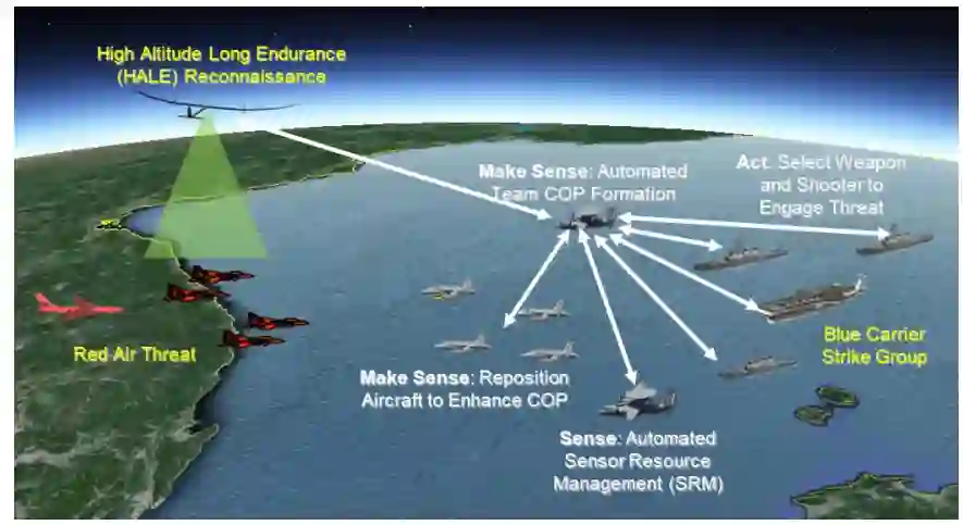 图1. 在DCA场景中,先进的算法协助人类作战人员感知:优化传感器性能以探测、定位和识别威胁;感知:分享信息和定位资产以确保整个团队有一个一致的 "共同作战图"(COP);以及行动:选择和分配适当的武器来对付即将到来的威胁。