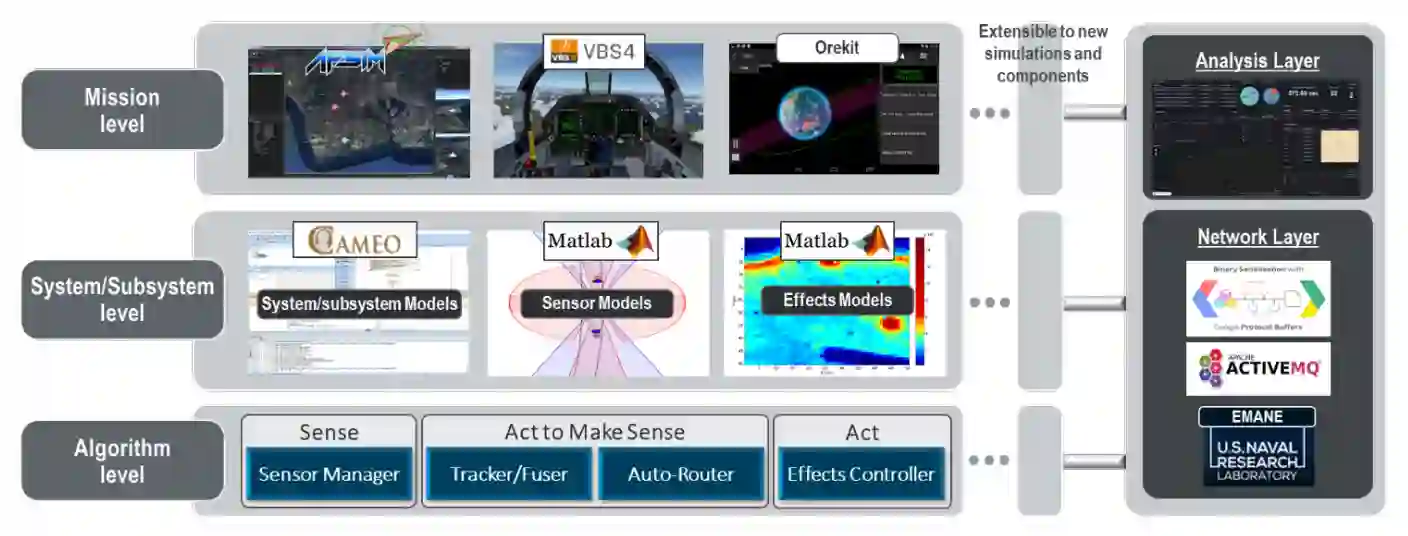 图4. JADO测试平台组件和架构在任务、系统/子系统和算法层面的仿真桥接