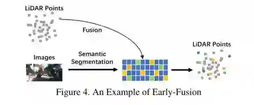 有的伙伴会说,直接把数据的格式统一,合并起来输入不就行了吗?但是现阶段的Early Fusion并不是这么暴力。 Early Fusion一般是激光雷达数据和Image图像进行融合或者是激光雷达数据与Image的特征进行融合,两种方式。如下图所展示的情况LiDAR这个分支与Image信息的早期信息交互的过程。这种方式在reflectance, voxelized tensor, front-view/ range-view/ BEV,pseudo-point clouds都可以使用。尽管Image的特征在各个阶段都不同,但是都与LiDAR的信息高度相关。所以LiDAR信息+Image特征融合也是可以有效进行融合的。因为LiDAR的分支没有经过抽象化的特征提取阶段,所以这一阶段的数据仍具有可解释性,因此,LiDAR的数据表示依然可以进行直观的可视化。 激光雷达前融合 从图像的角度上看,严格意义上对数据级别图片的定义只能是包含RGB或Gray等数据。其实这种定义方式缺乏通用性和合理性,也比较局限。所以我们格局要大一点,数据级别可以不仅仅是图像,也可以是特征图。与传统的早期融合定义相比,文章将相机数据的定义不仅仅局限在image上,也将特征信息纳入其中。有意识的对特征信息进行选择融合,得到一个语义连接更加紧密的输入数据,之后将这个数据集进行放入网络进行特征提取。 无论是直接将数据类型转化一致,然后concat成一体,还是LiDAR信息与Image的特征信息进行融合,还是说两者先进行特征的语义连接后成为输入,这些都是Early Fusion的操作。其实这样的输入一体化操作的好处自然是结构简便、容易部署。通过语义的提前交互,也解决了传统早期融合,模态之间语义信息交互不充分的问题。所以一定程度上,选择Early Fusion也是一个不错的选择。