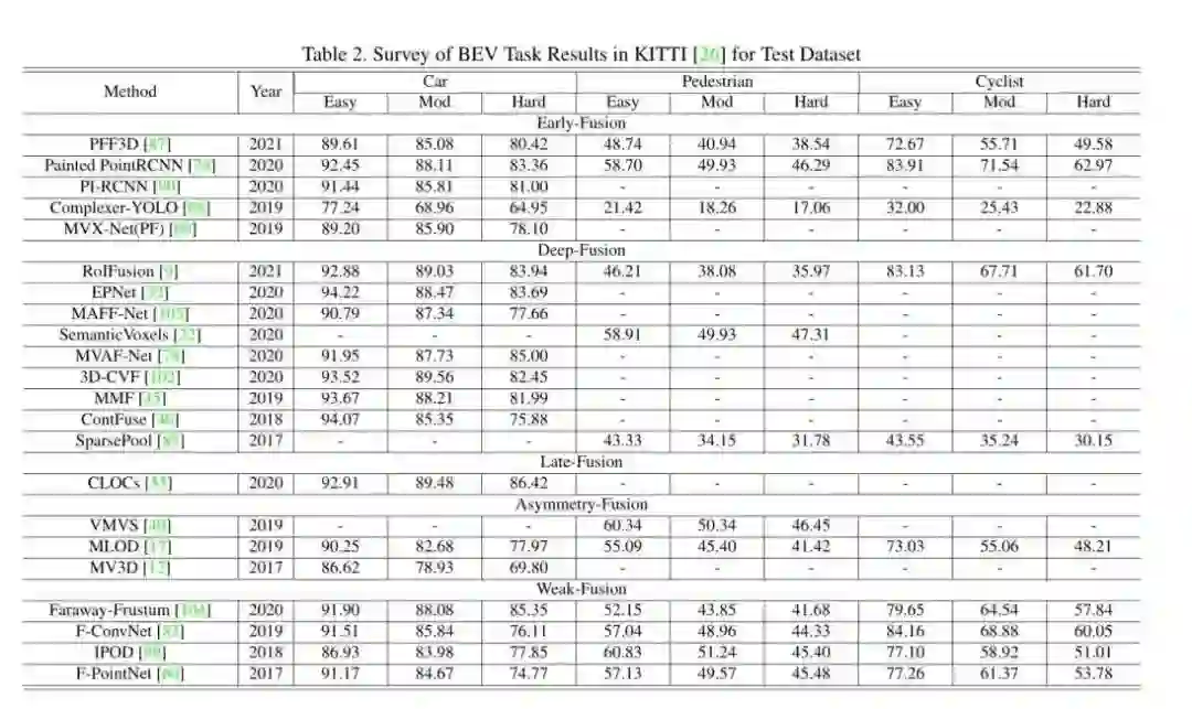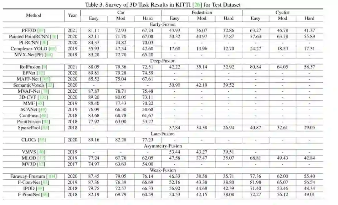 有些工作不能简单地定义为上述任何一种融合,因为它们在整个模型框架中拥有不止一种融合方法。造融合怪是我们这些盐究圆天生的技能,你说A有xxx好处,B有xxx好处,那我A+B不就是直接赢麻了吗?但是事实上,很多情况都不能有效的把方法缝合进去。如深度融合和后融合方案的相互结合,或者将前融合和深度融合结合在一起。这些方法在模型设计上存在冗余问题,并不是融合模块的主流方法,即没有取得A+B的效果,反而极大的牺牲了推理时间已经增大了算法的复杂度。一些实验结果 2Dkitti上的结果