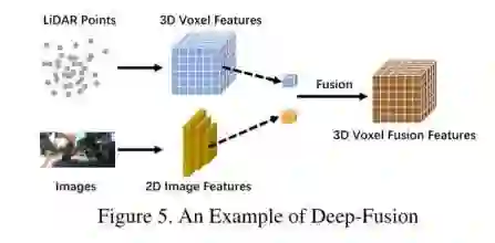 深度特征融合的方法其实也很常见。如下图 深度特征融合 我们可以很直接清晰的看到LiDAR点图分支和Images分支在经过各自的特征提取器后,得到高维度的特征图,并通过一系列下游模块对两个分支模态进行融合。与其他的融合方式不同,深度融合有时候也会通过级联的方式对高级特征和原始特征进行融合,同时利用高级的特征信息和含有丰富物理信息的原始特征。